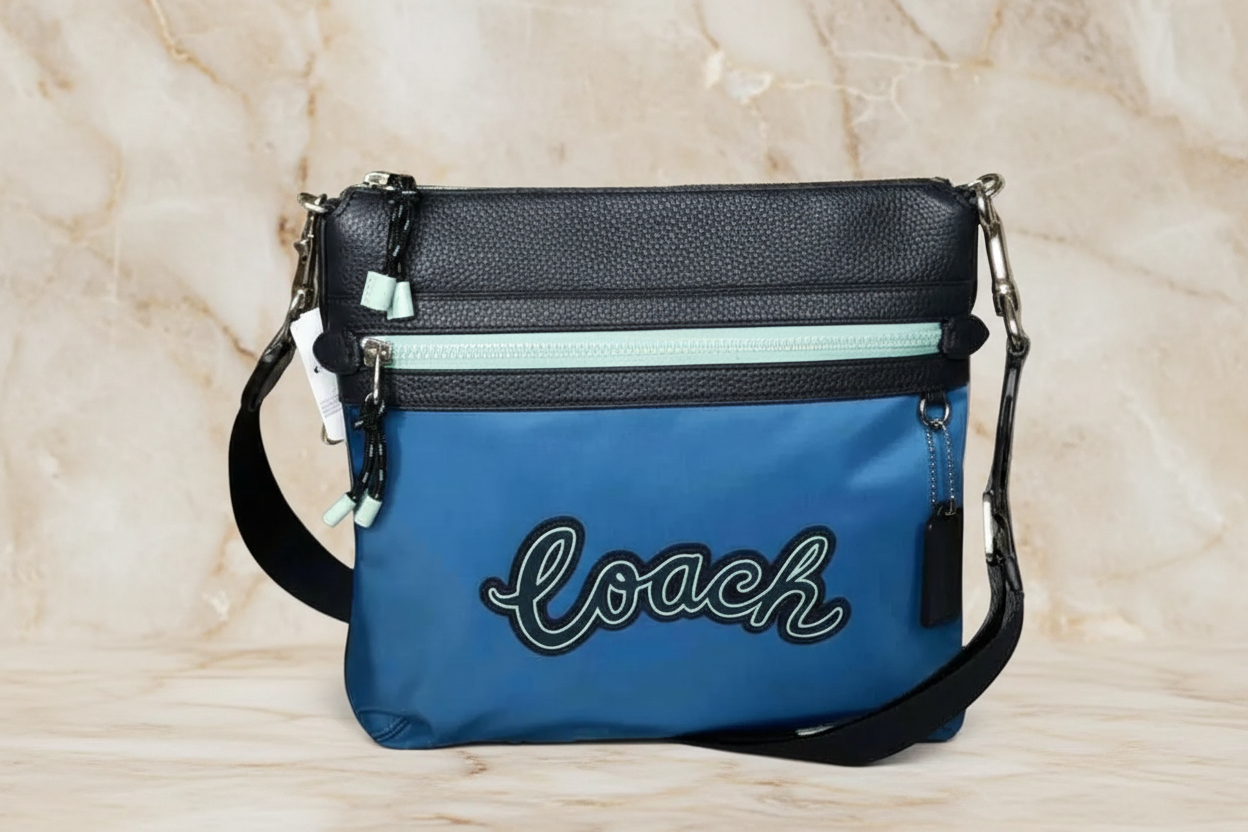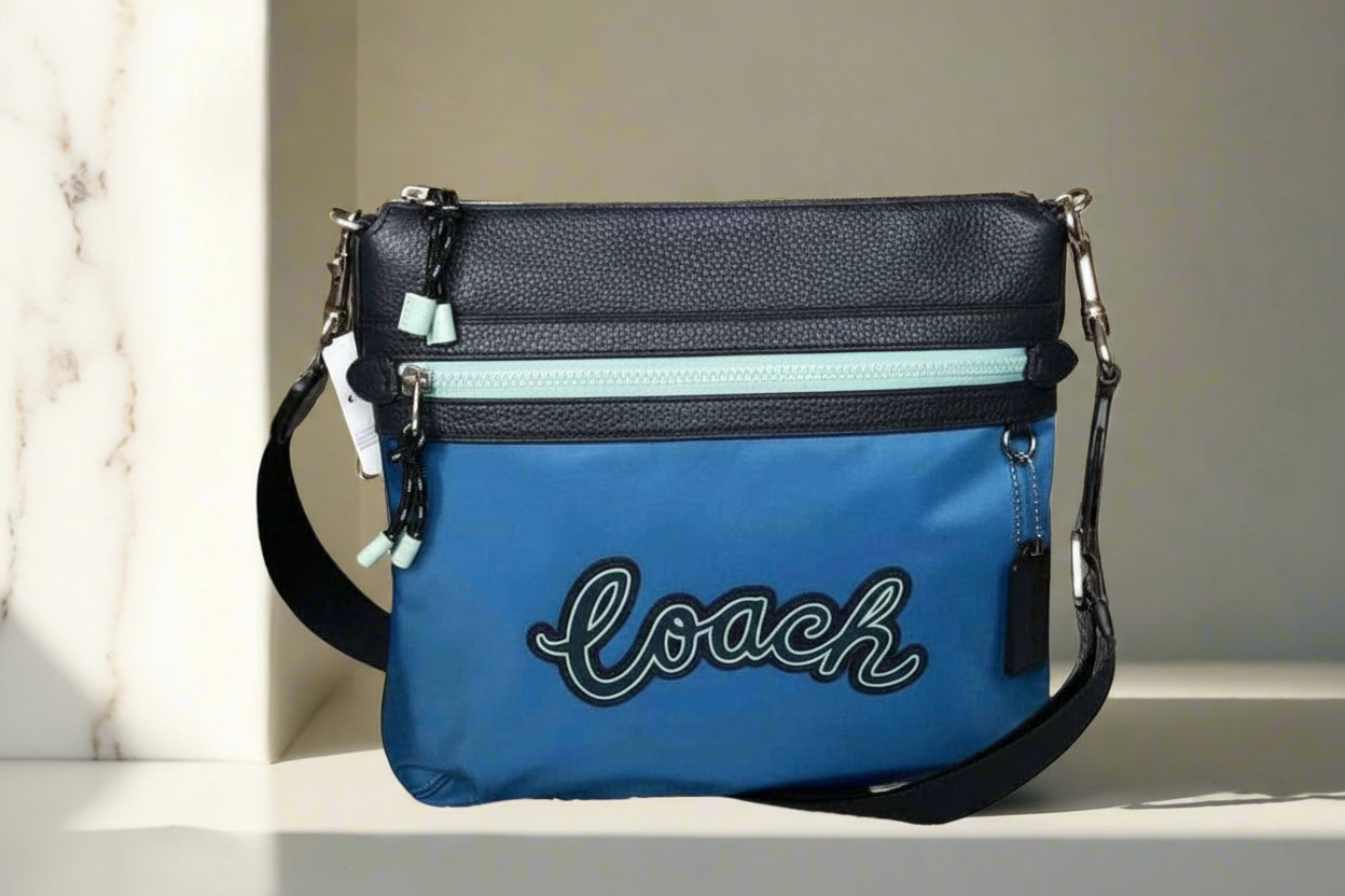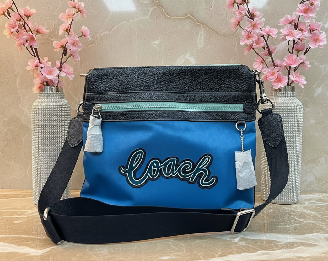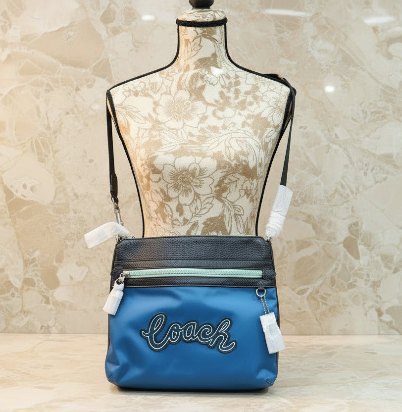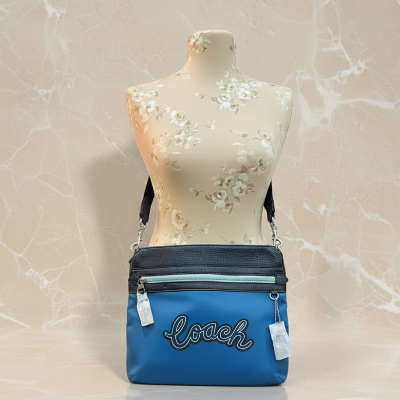 حقيبة كروسبودي من كوتش فال فايل - نايلون/جلد محبب، لون أزرق سماوي متعدد الألوان
