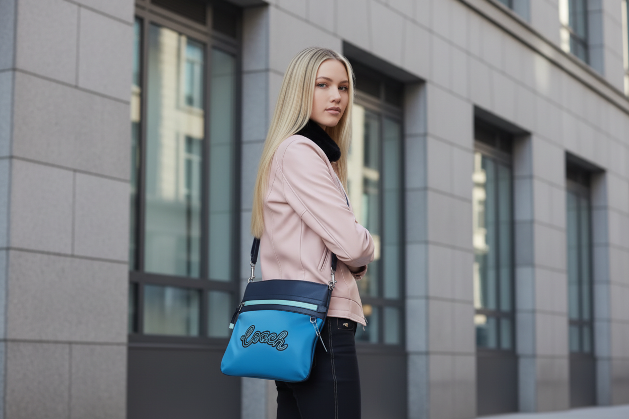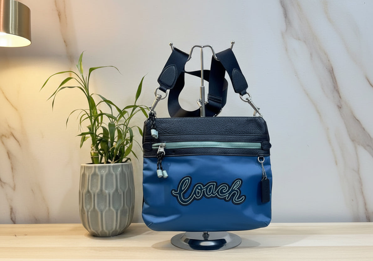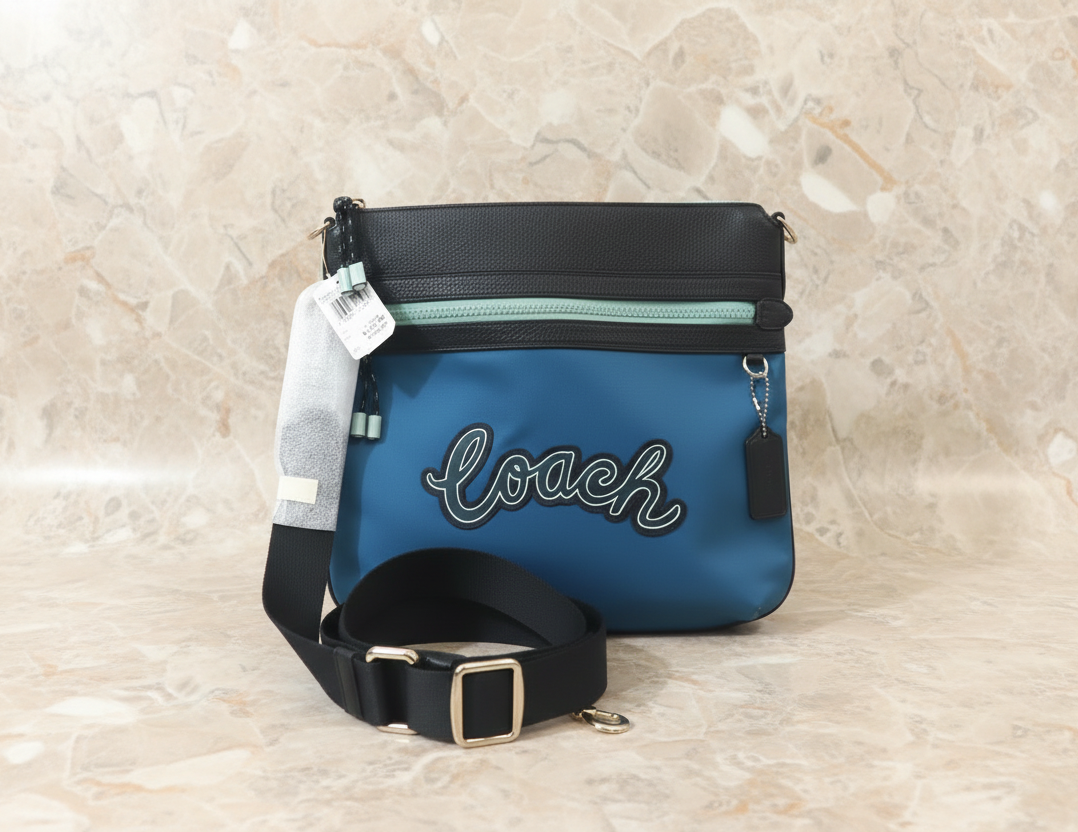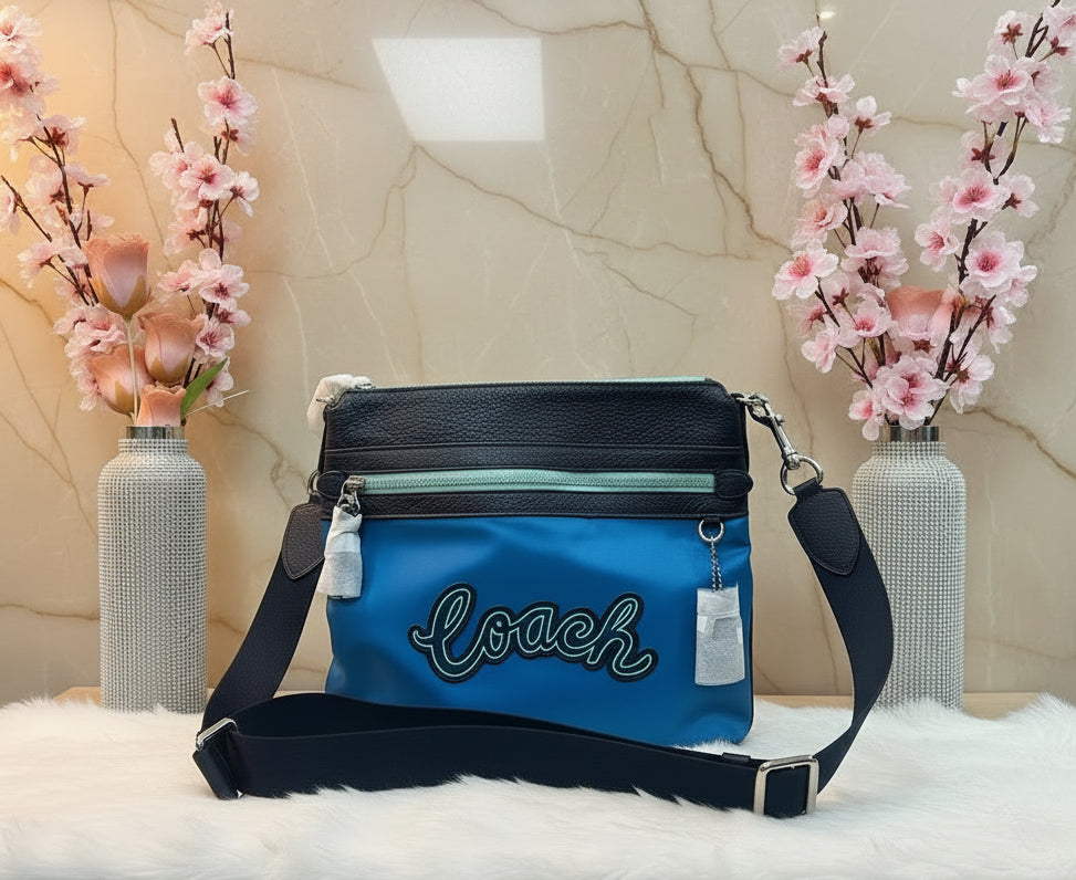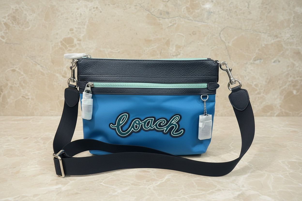 حقيبة كروسبودي من كوتش فال فايل - نايلون/جلد محبب، لون أزرق سماوي متعدد الألوان