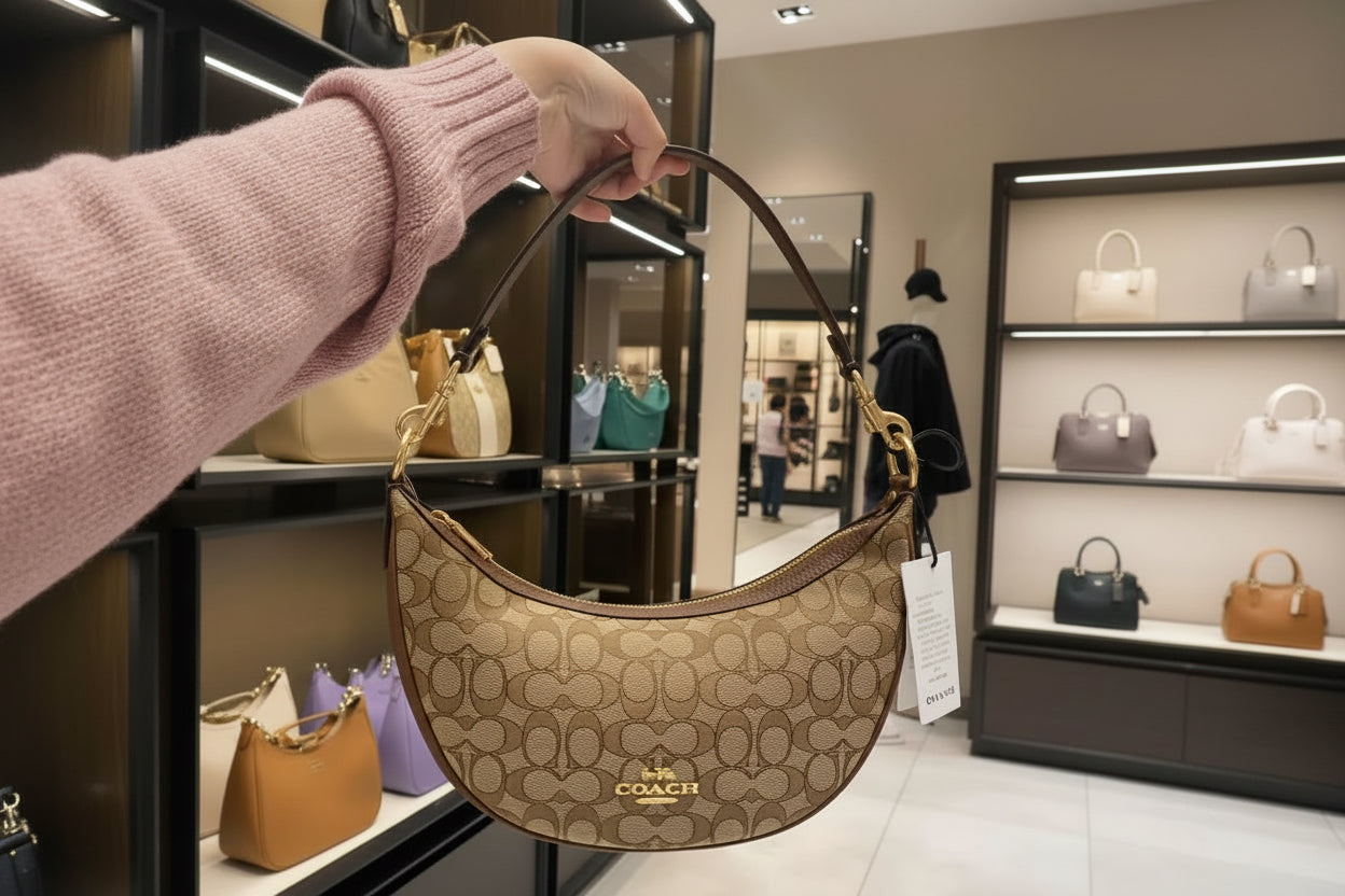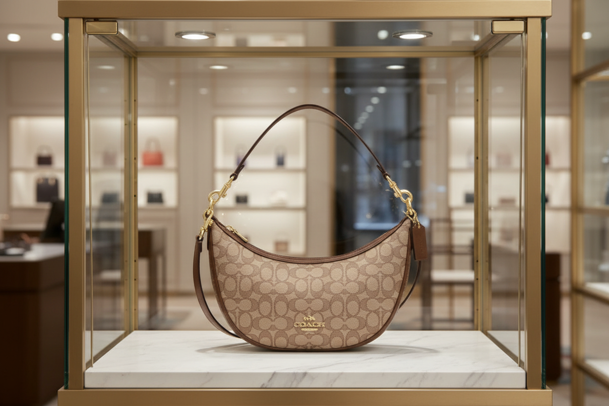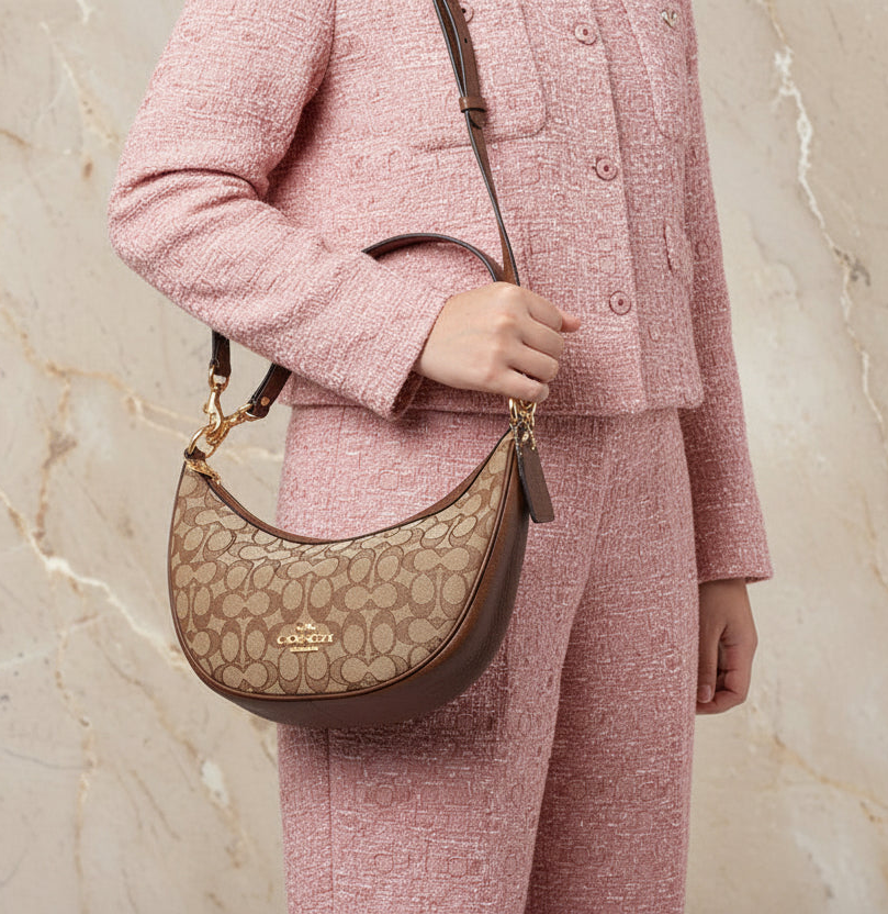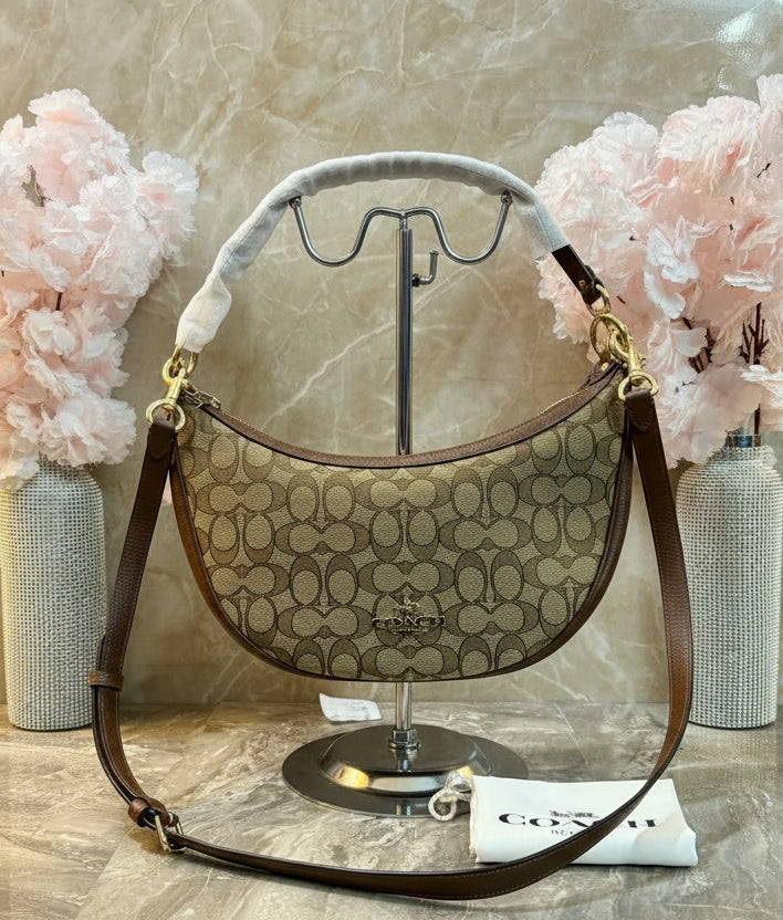 حقيبة كتف/حقيبة كروس بودي من كوتش آريا بنقشة جاكار مميزة باللون الكاكي