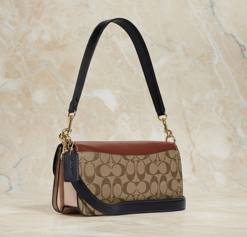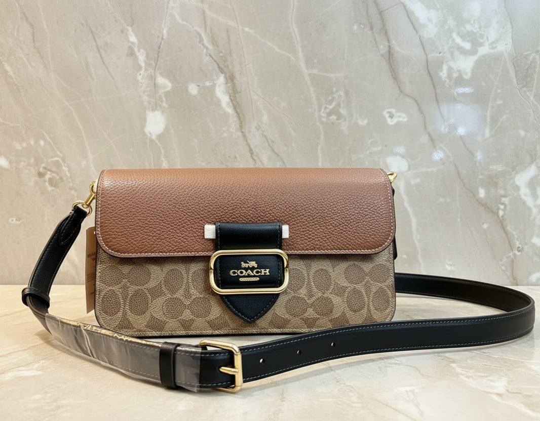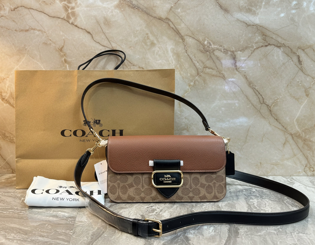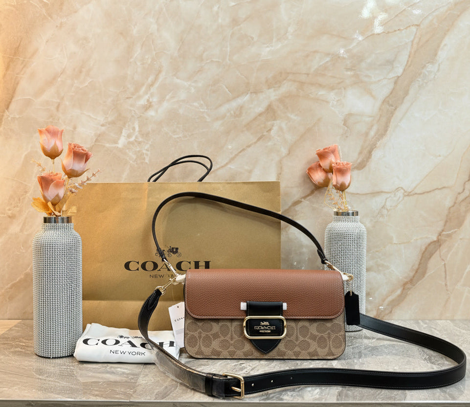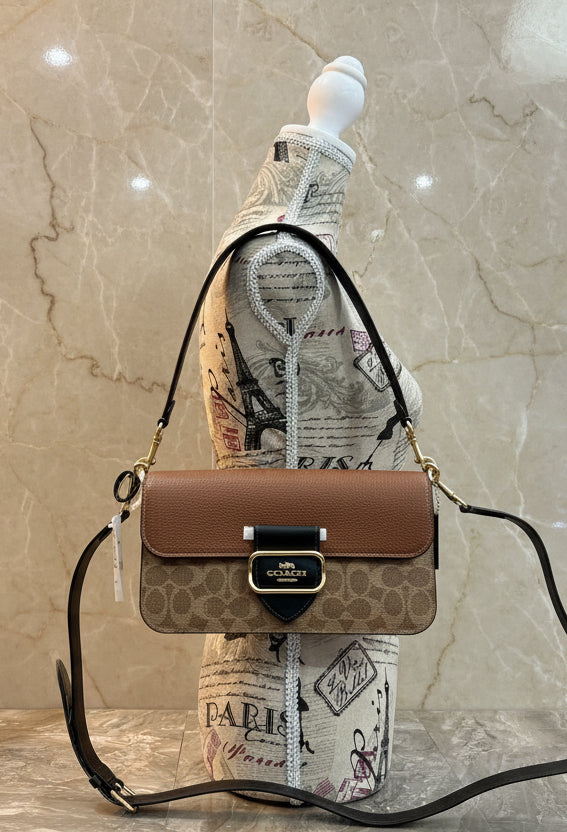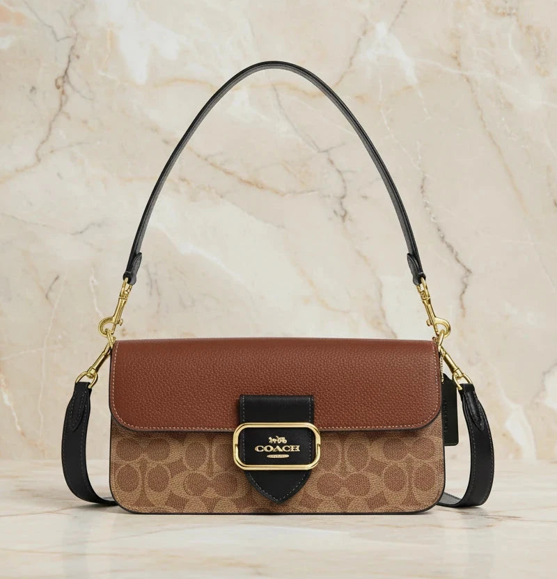 - حقيبة كتف كوتش مورغان من قماش الكانفاس المميز بألوان متداخلة ذهبية/كاكي متعددة
