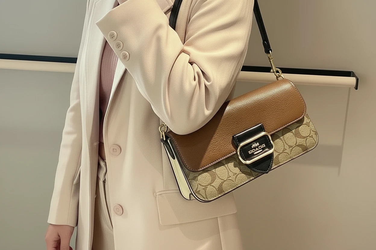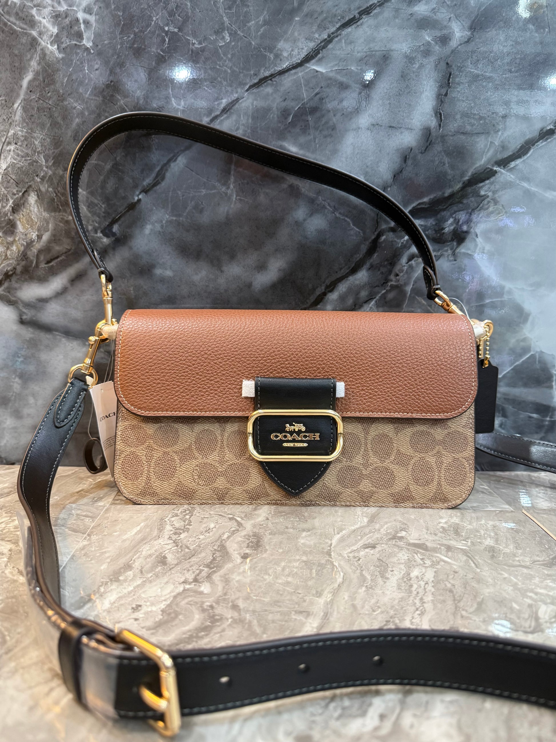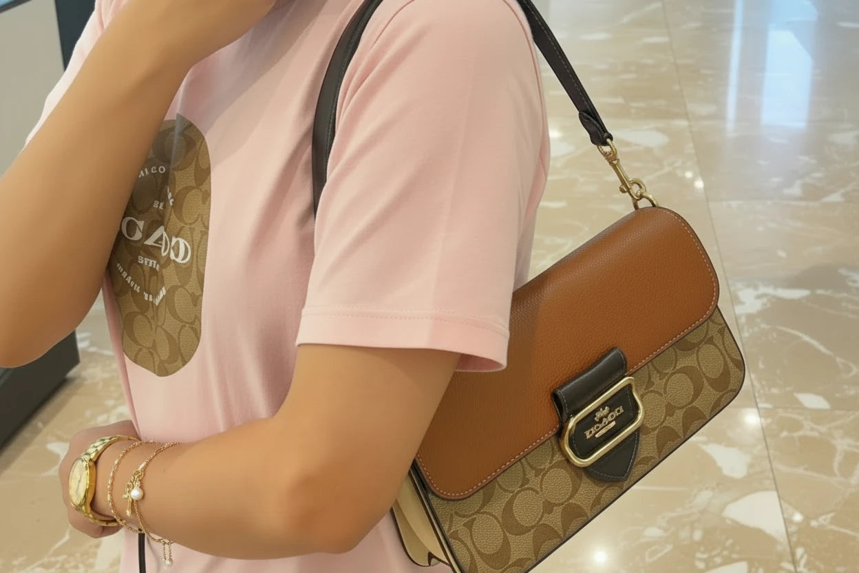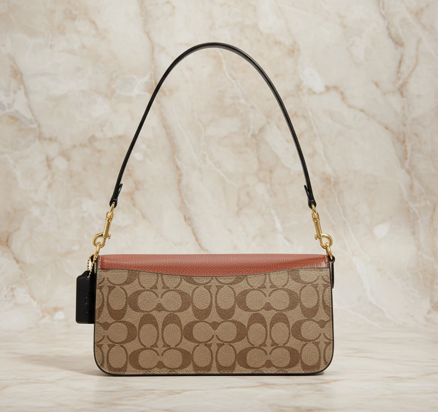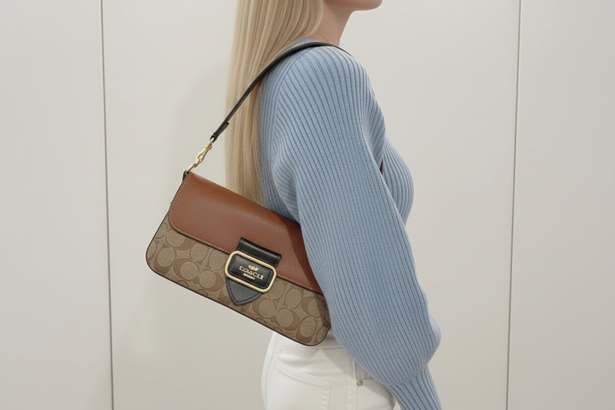 - حقيبة كتف كوتش مورغان من قماش الكانفاس المميز بألوان متداخلة ذهبية/كاكي متعددة
