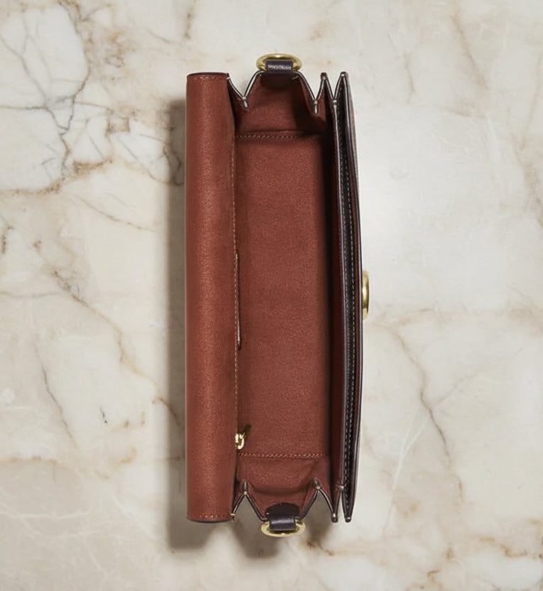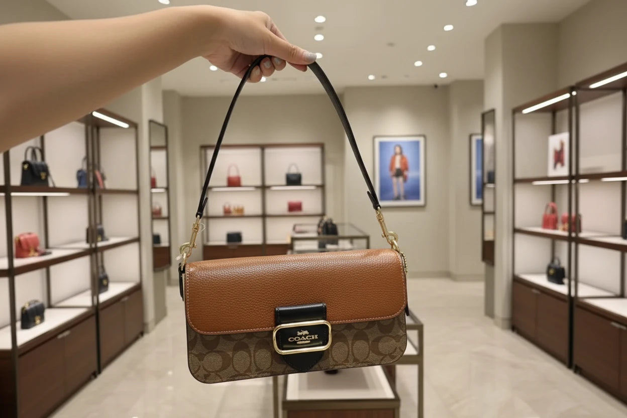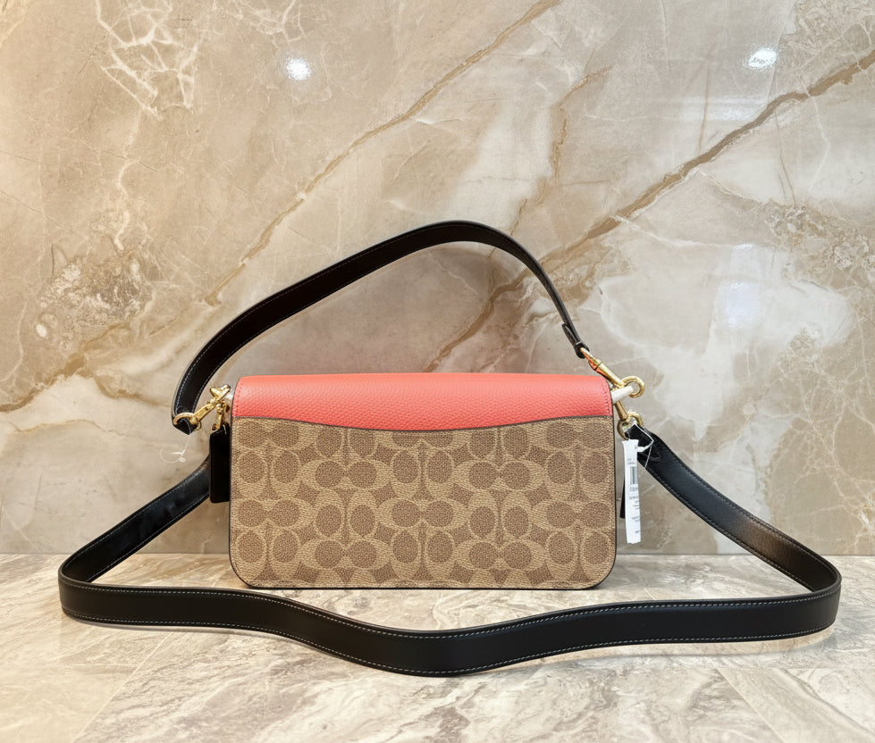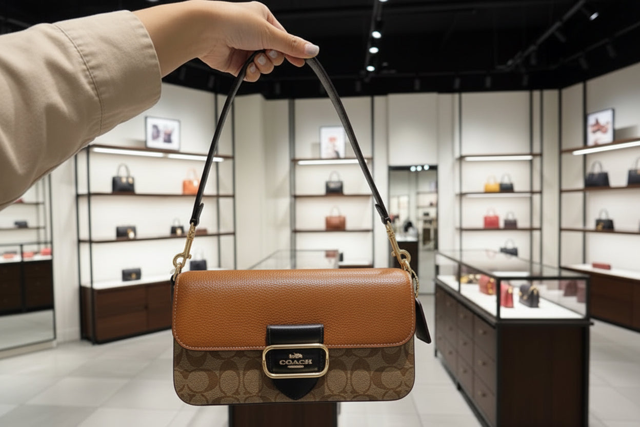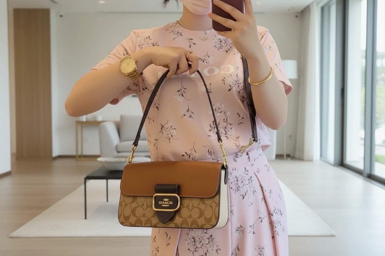 - حقيبة كتف كوتش مورغان من قماش الكانفاس المميز بألوان متداخلة ذهبية/كاكي متعددة
