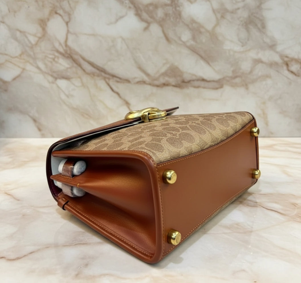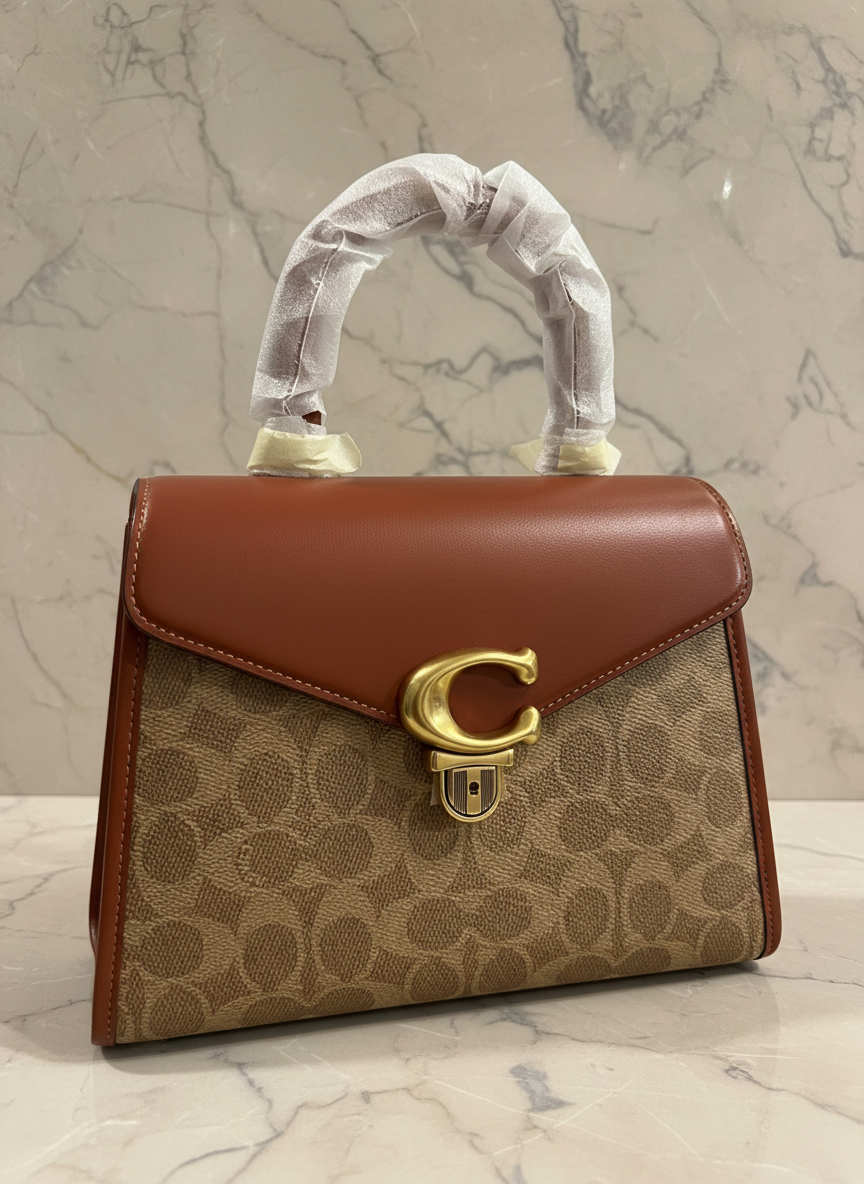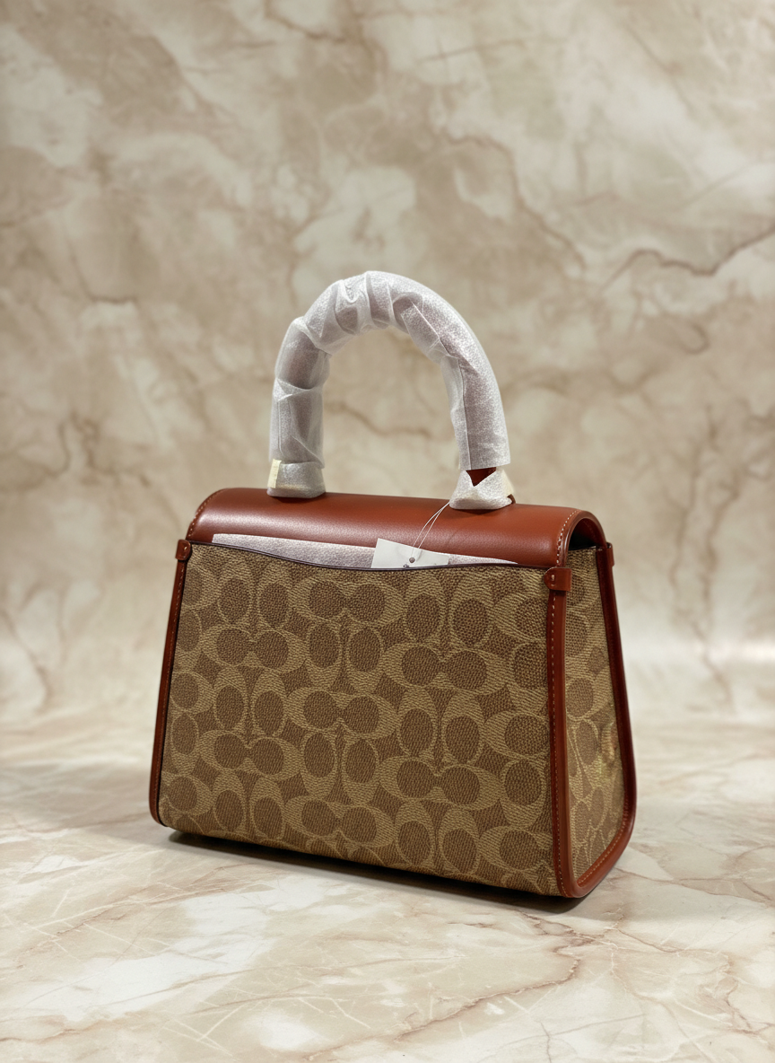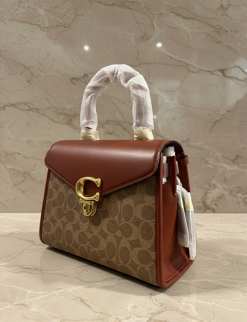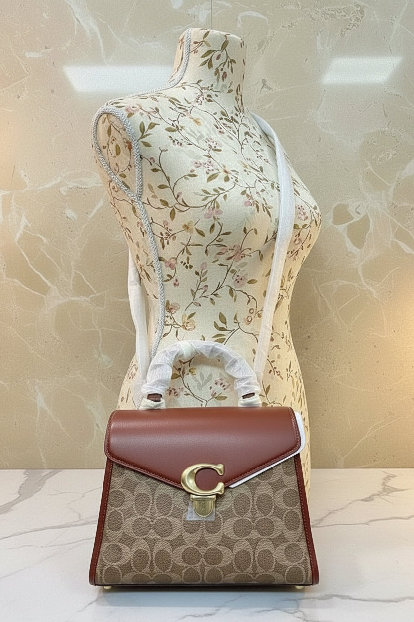 حقيبة كوتش سامي ذات المقبض العلوي من قماش الكانفاس المميز/ النحاس/ البني الفاتح/ الصدأ - مصنوعة من جلد العجل الفاخر، وقماش الكانفاس المطلي مع حزام قابل للفصل. جيب متعدد الوظائف. مقبض علوي بطول 3.5 بوصة