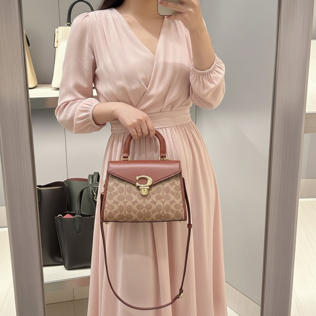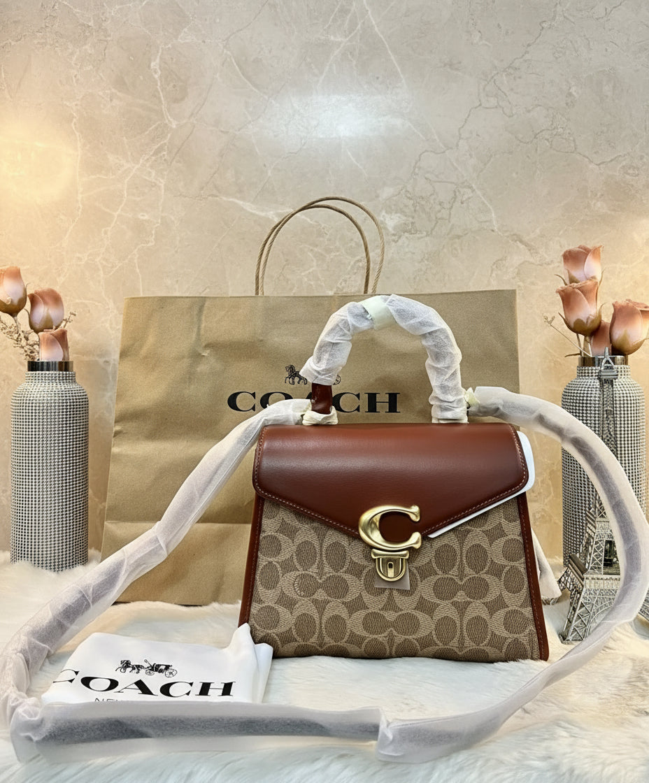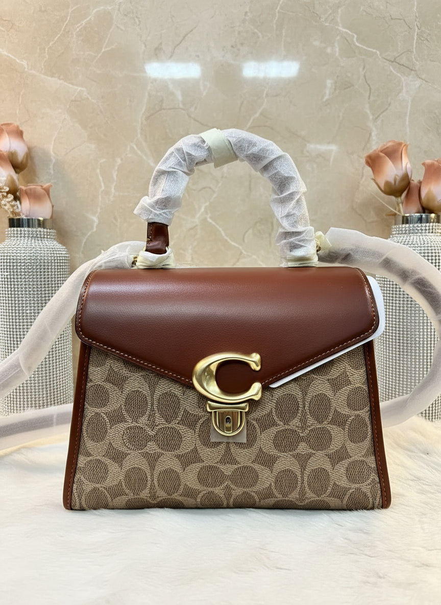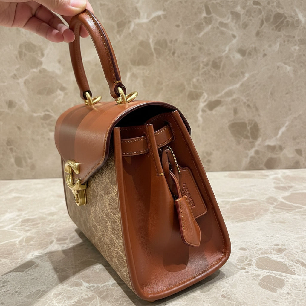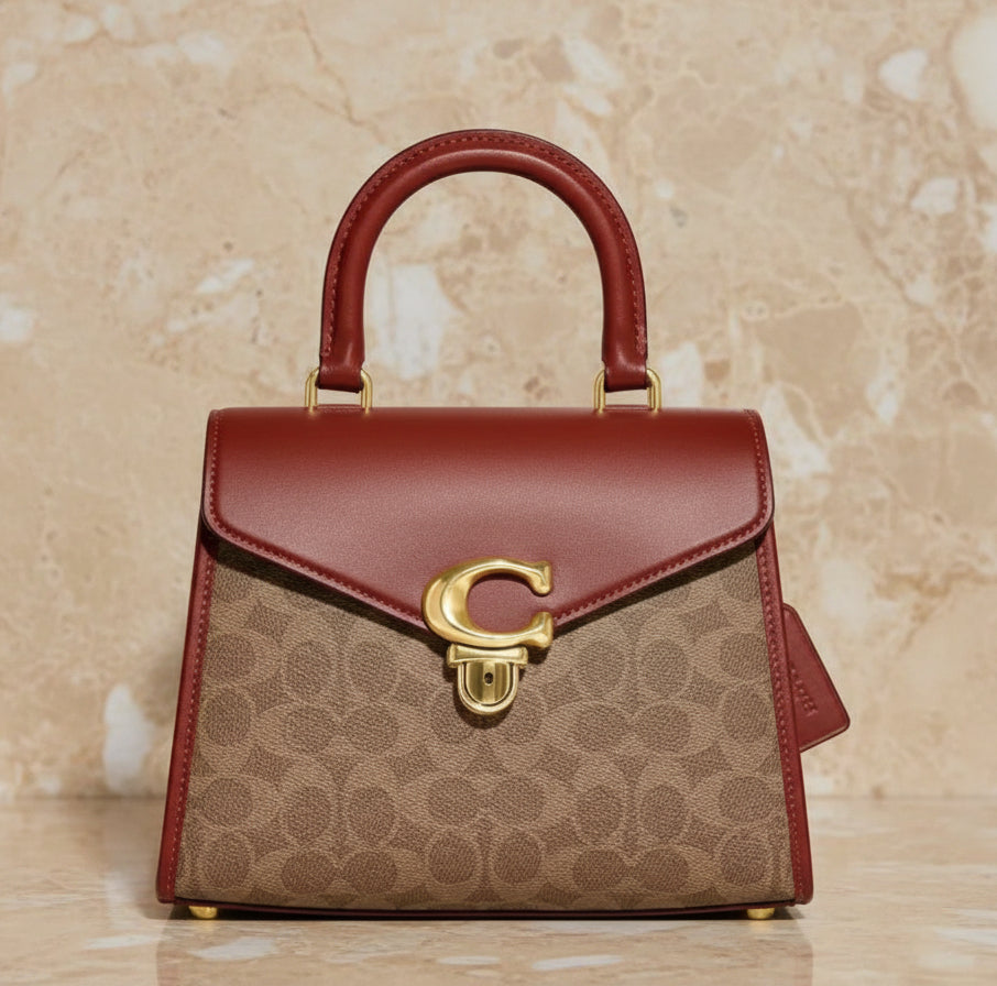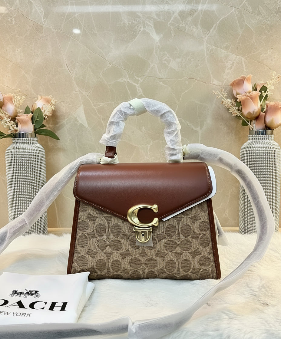 حقيبة كوتش سامي ذات المقبض العلوي من قماش الكانفاس المميز/ النحاس/ البني الفاتح/ الصدأ - مصنوعة من جلد العجل الفاخر، وقماش الكانفاس المطلي مع حزام قابل للفصل. جيب متعدد الوظائف. مقبض علوي بطول 3.5 بوصة