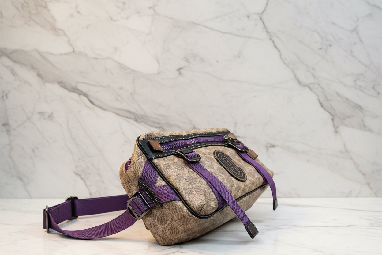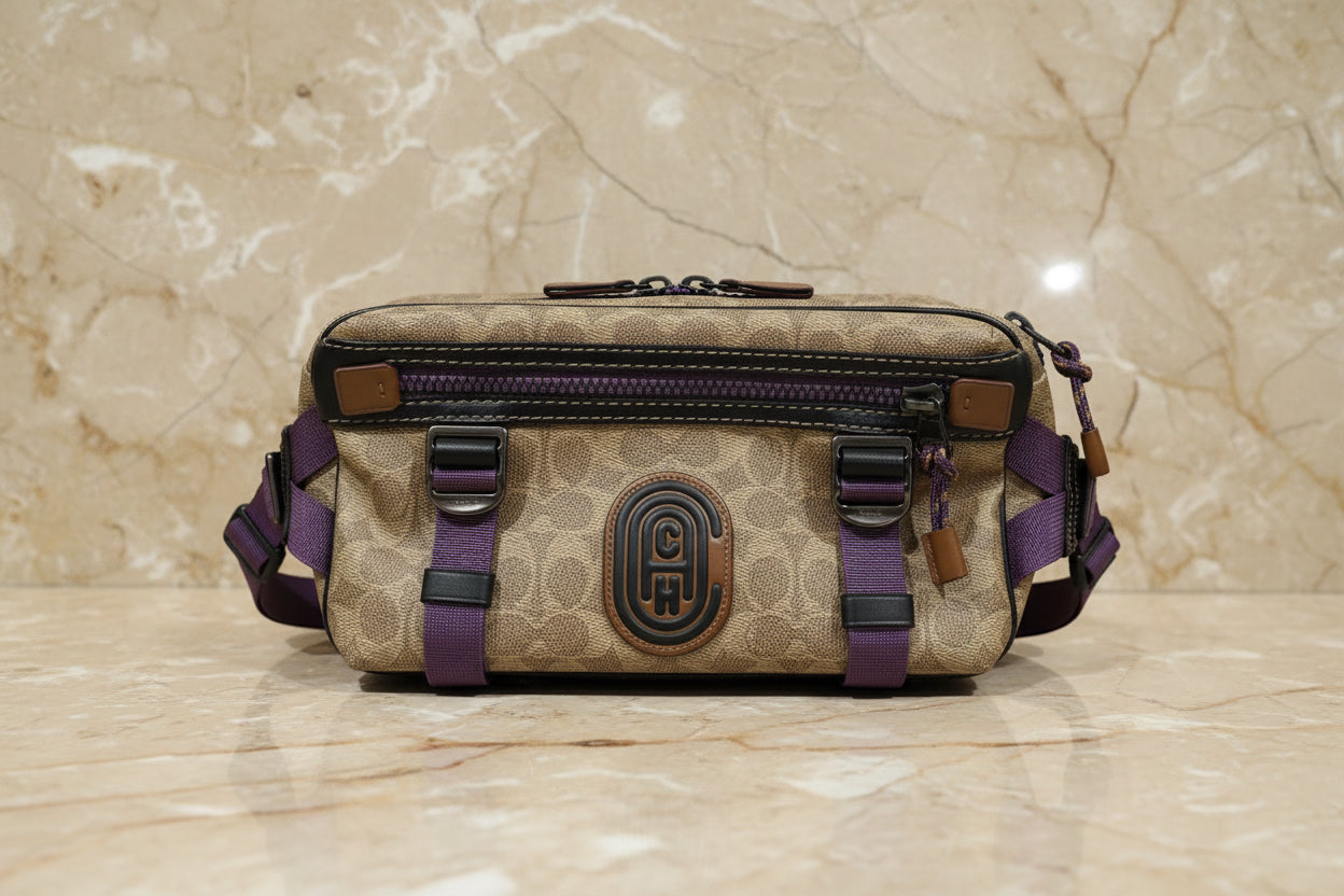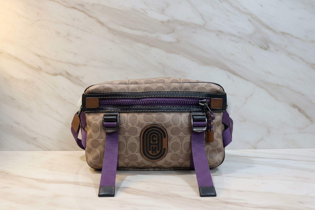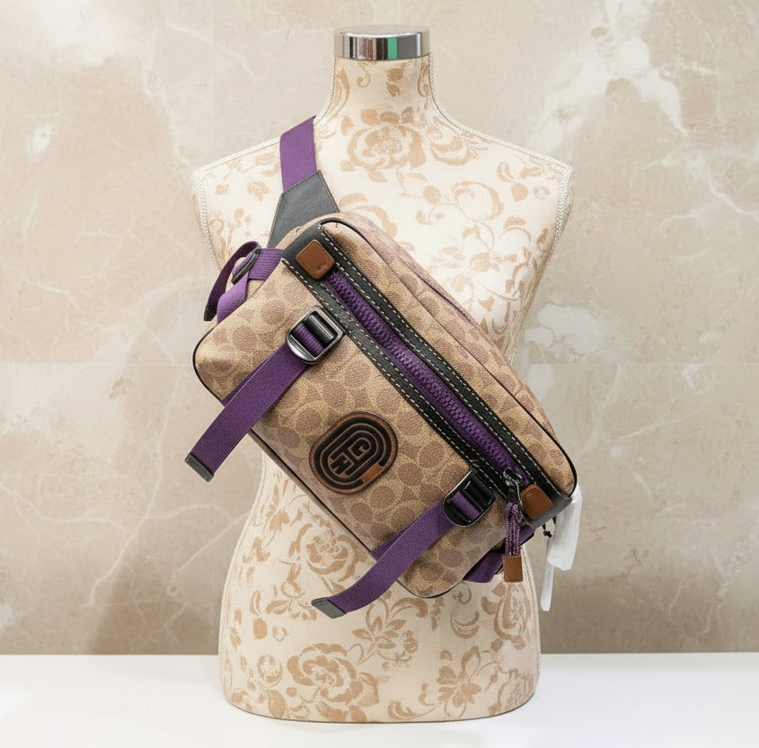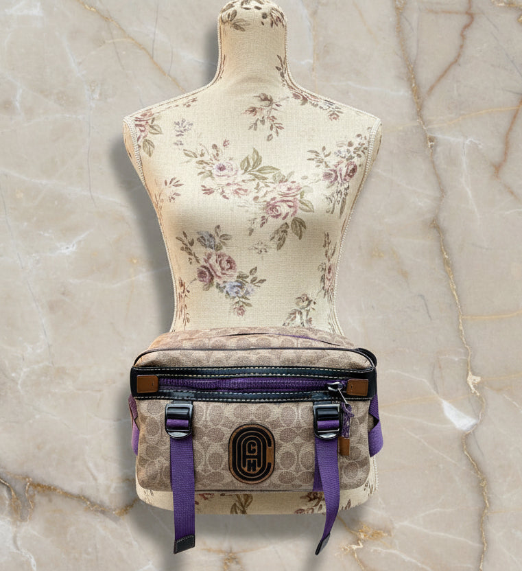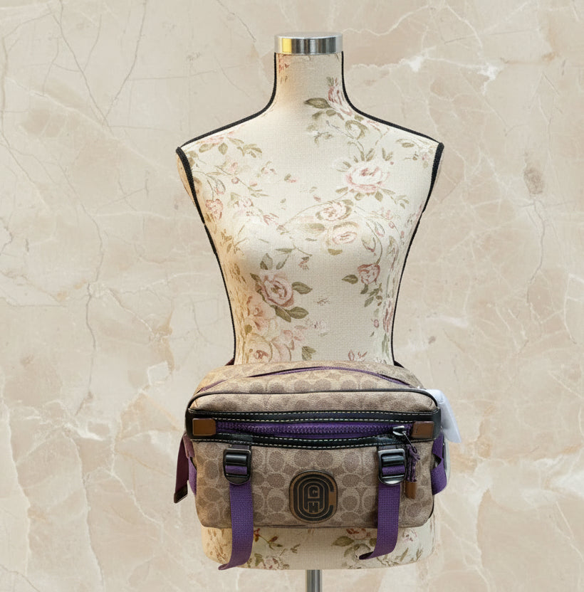 حقيبة خصر/حقيبة جسم محدودة الإصدار مطبوعة بشعار كوتش، مصنوعة من قماش الكانفاس البني المميز.