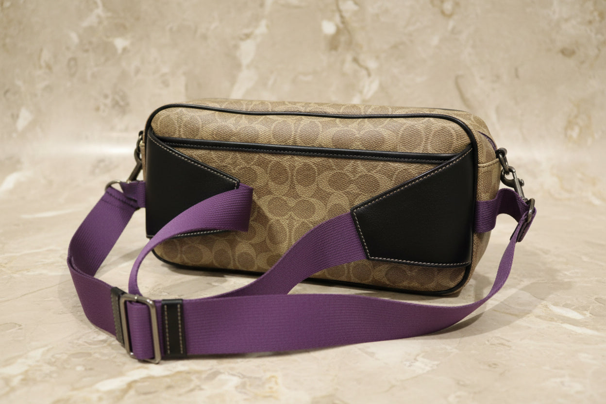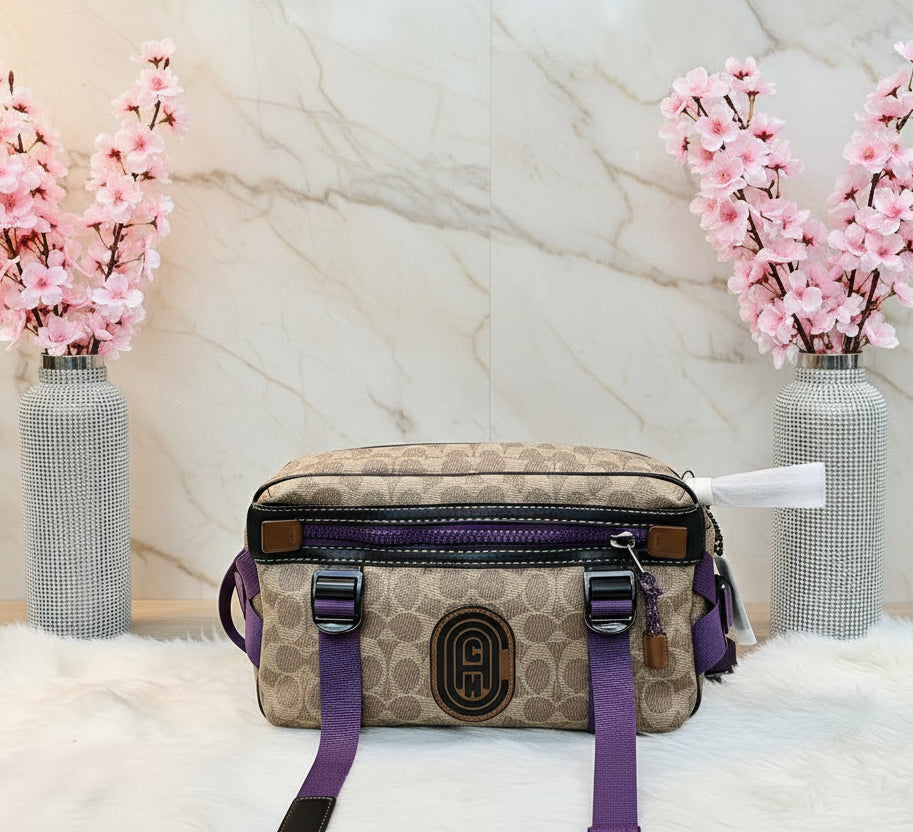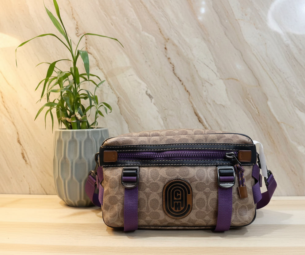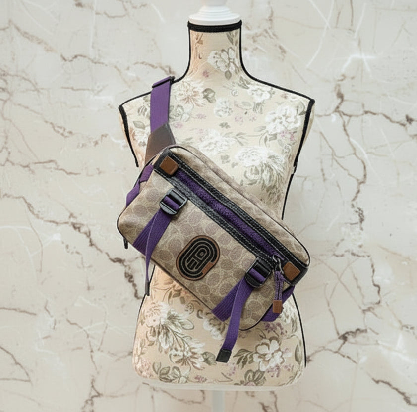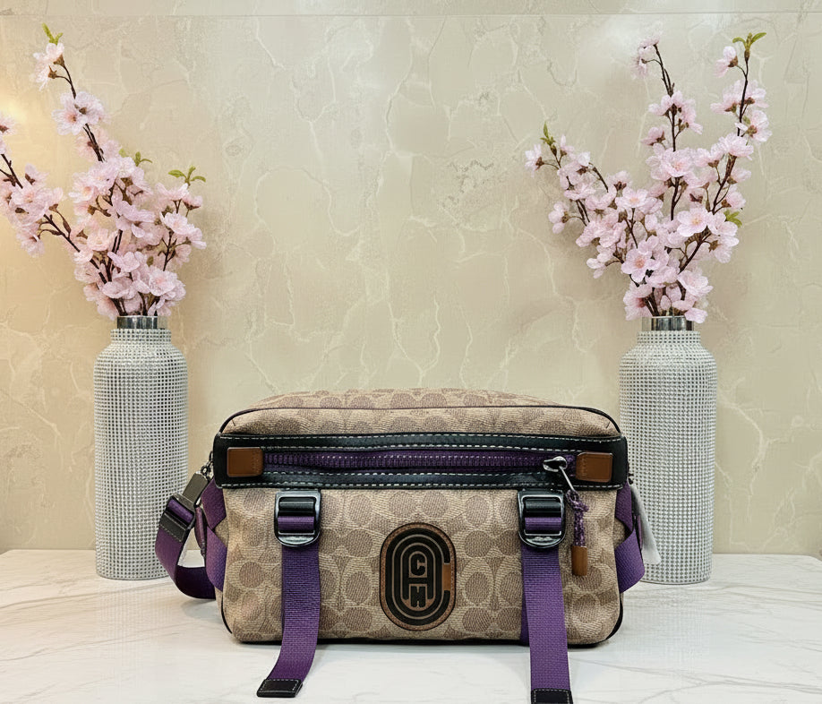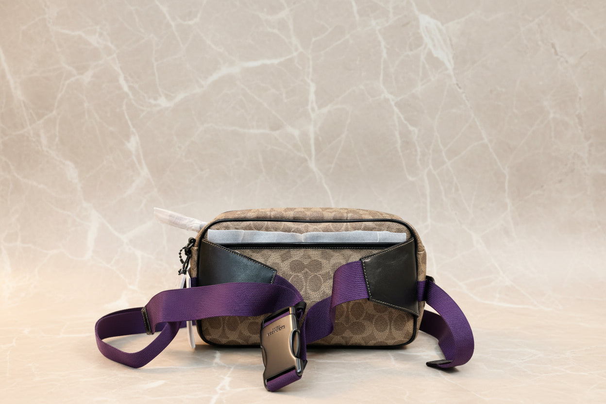 حقيبة خصر/حقيبة جسم محدودة الإصدار مطبوعة بشعار كوتش، مصنوعة من قماش الكانفاس البني المميز.