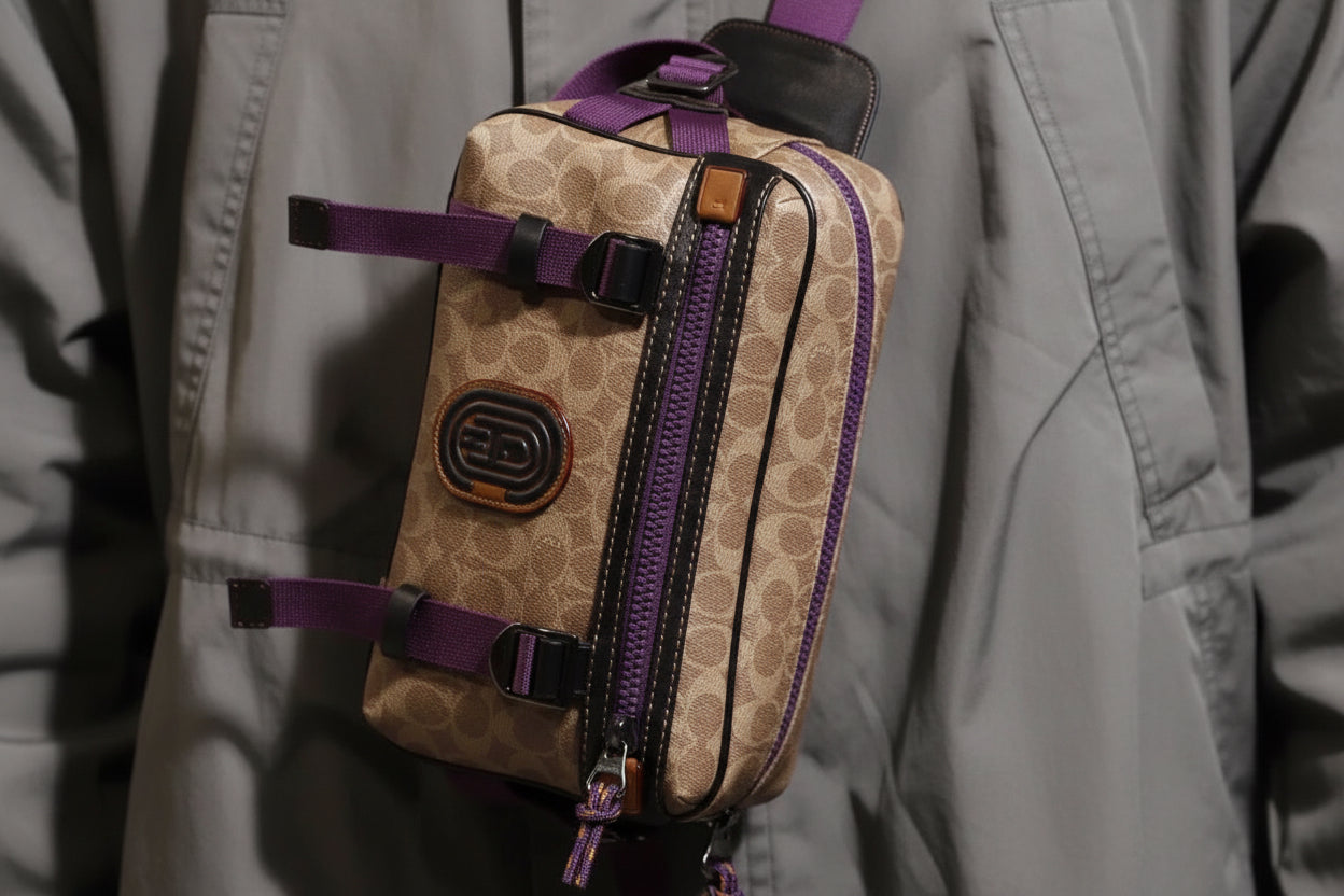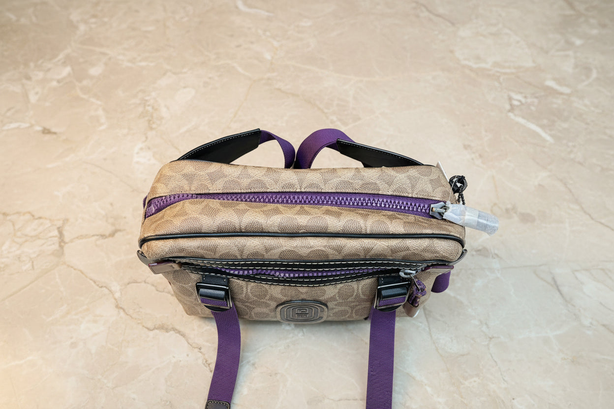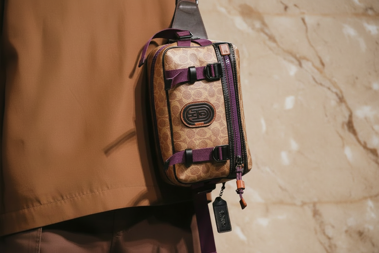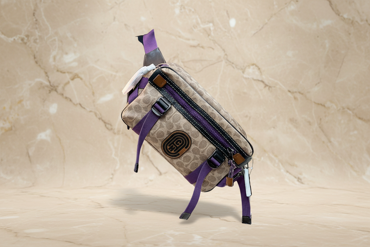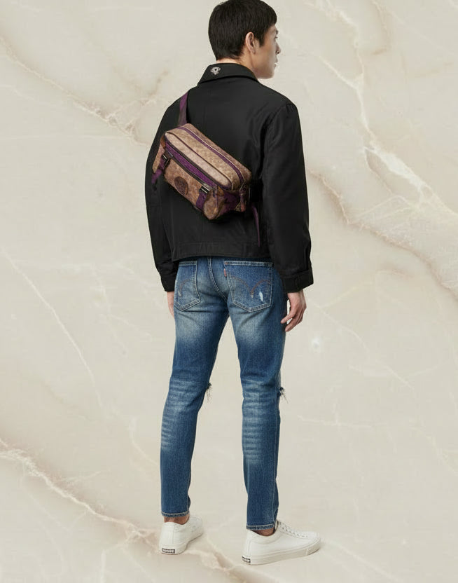 حقيبة خصر/حقيبة جسم محدودة الإصدار مطبوعة بشعار كوتش، مصنوعة من قماش الكانفاس البني المميز.