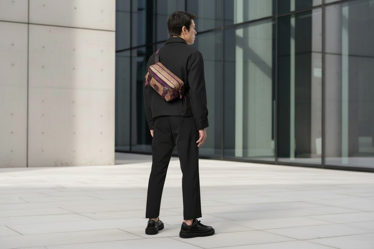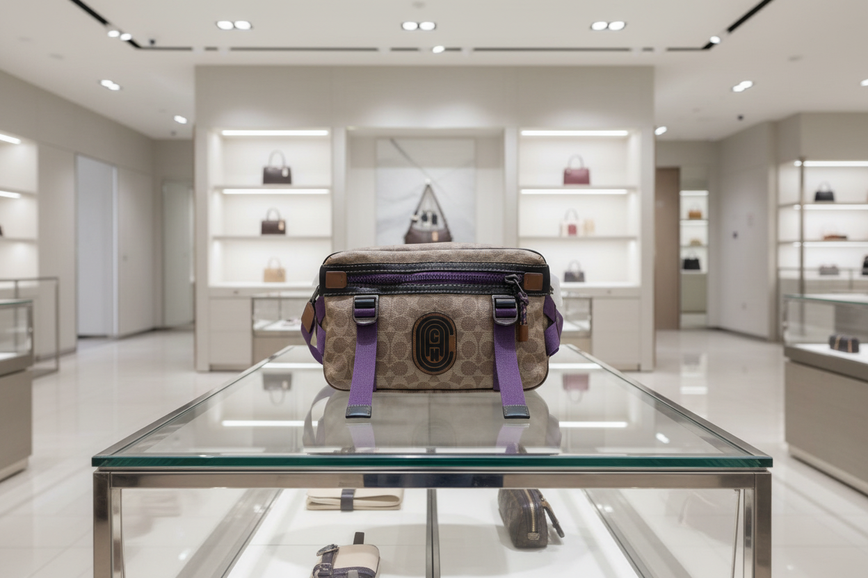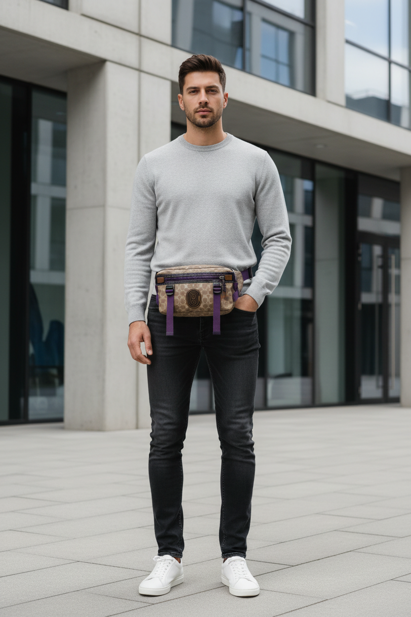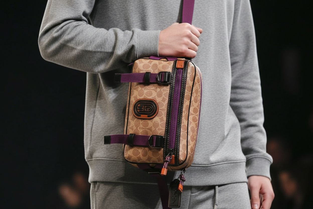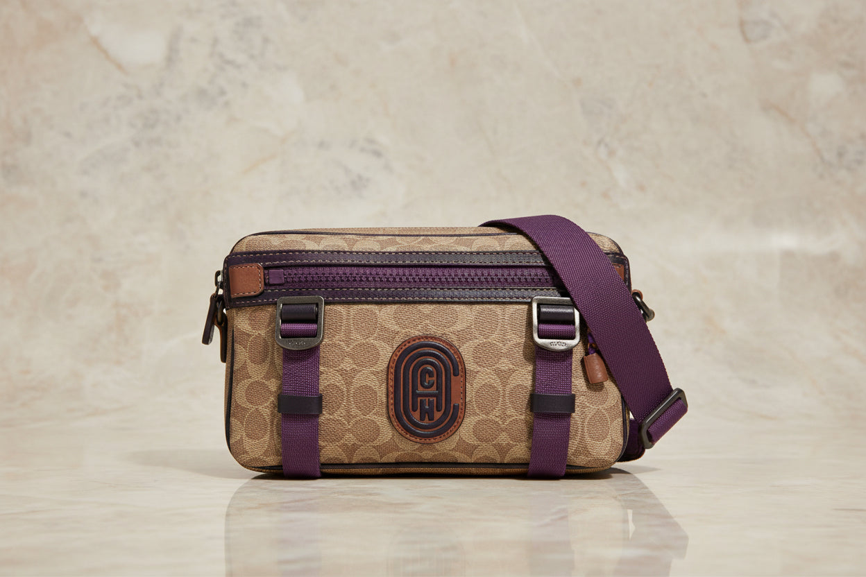 حقيبة خصر/حقيبة جسم محدودة الإصدار مطبوعة بشعار كوتش، مصنوعة من قماش الكانفاس البني المميز.