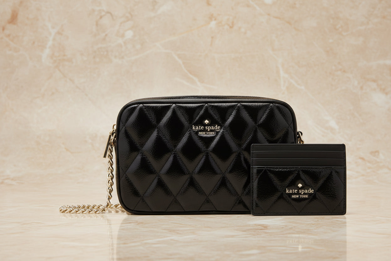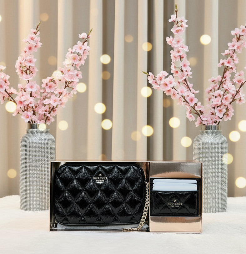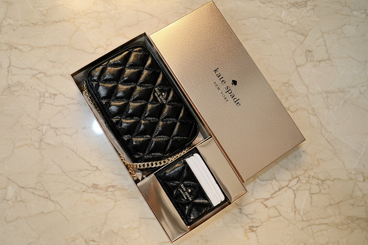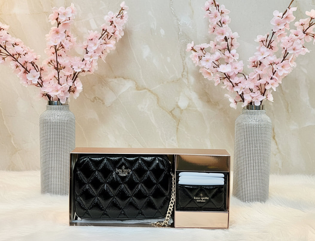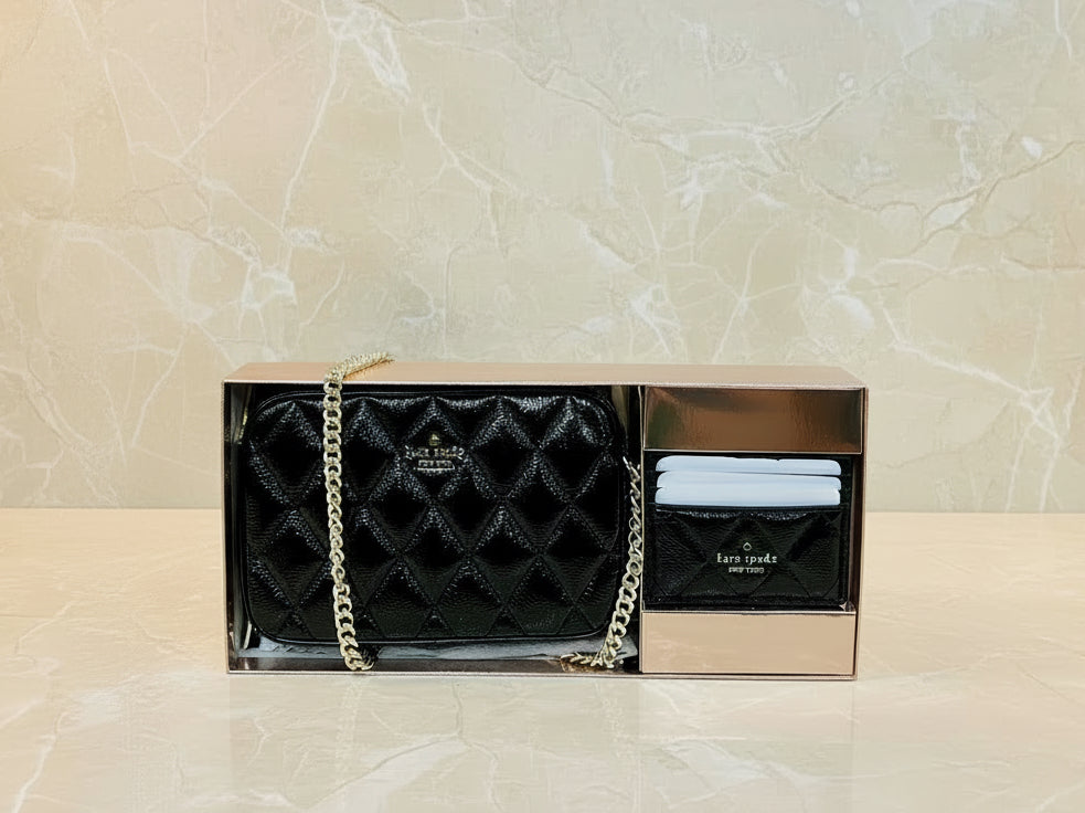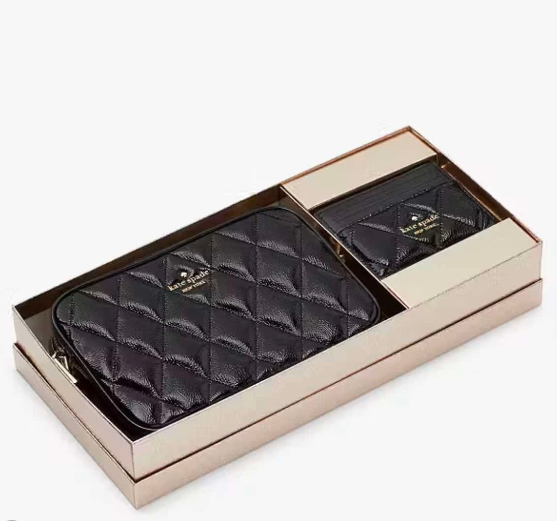 حقيبة كروسبودي من الجلد المبطن من كيت سبيد، مع حافظة بطاقات رفيعة، في علبة.
