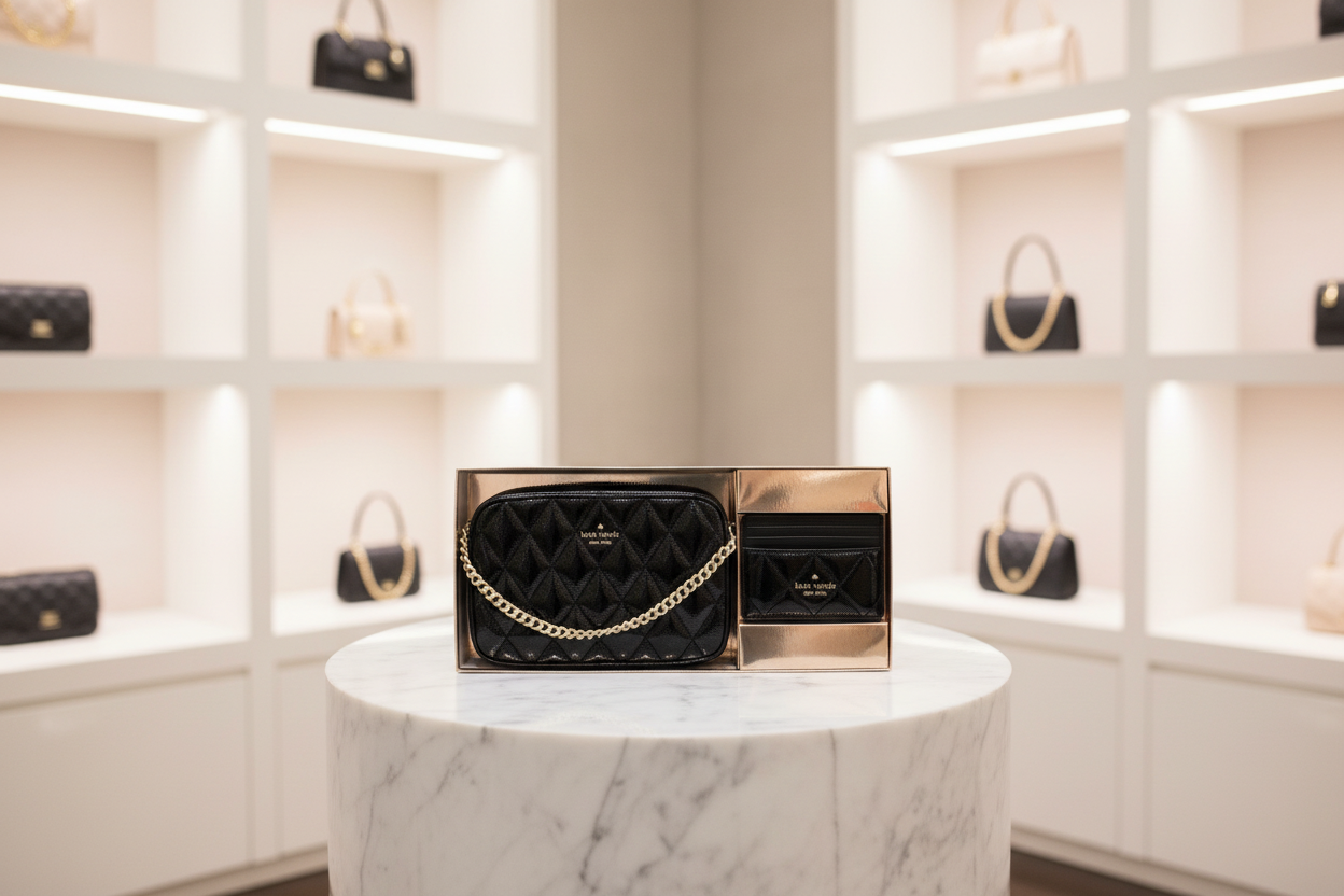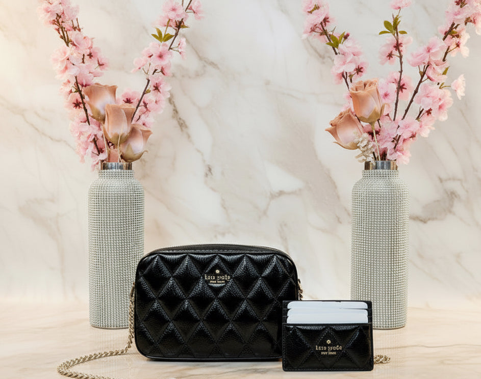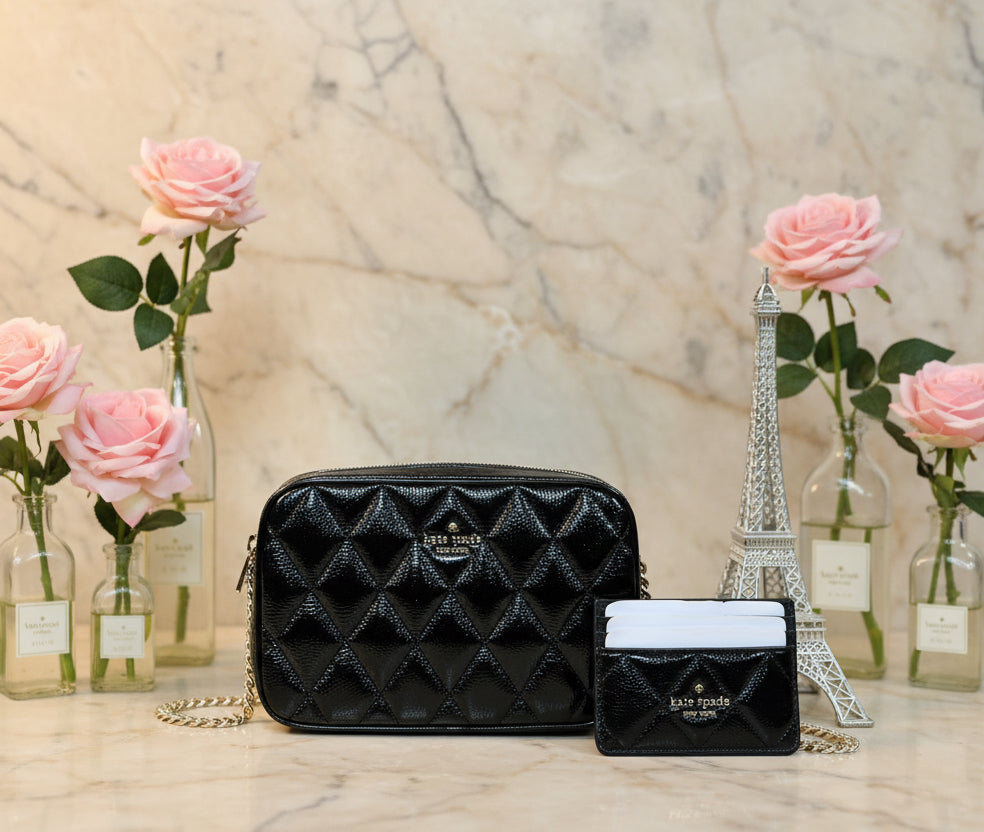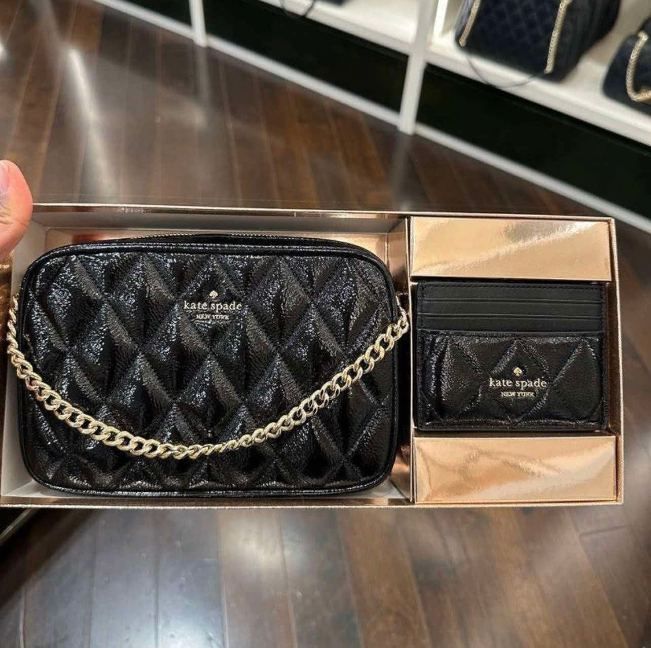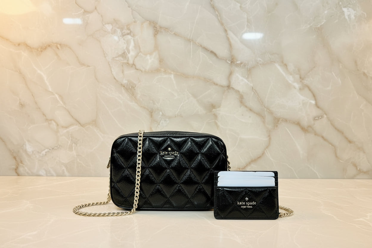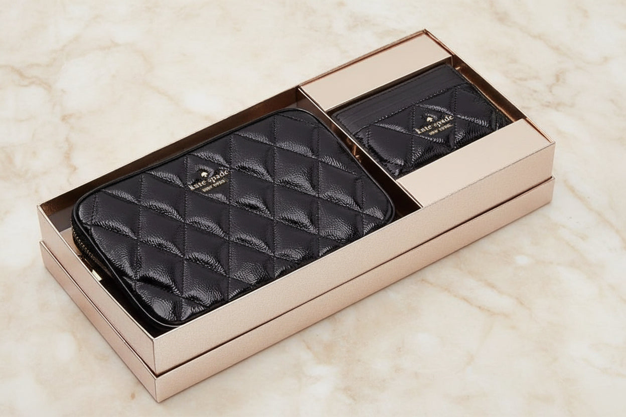 حقيبة كروسبودي من الجلد المبطن من كيت سبيد، مع حافظة بطاقات رفيعة، في علبة.