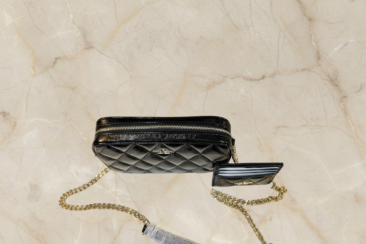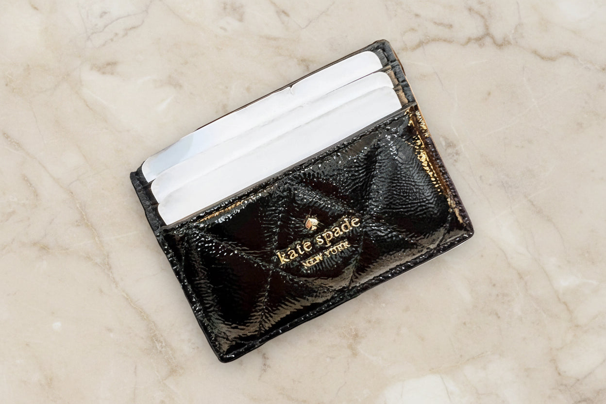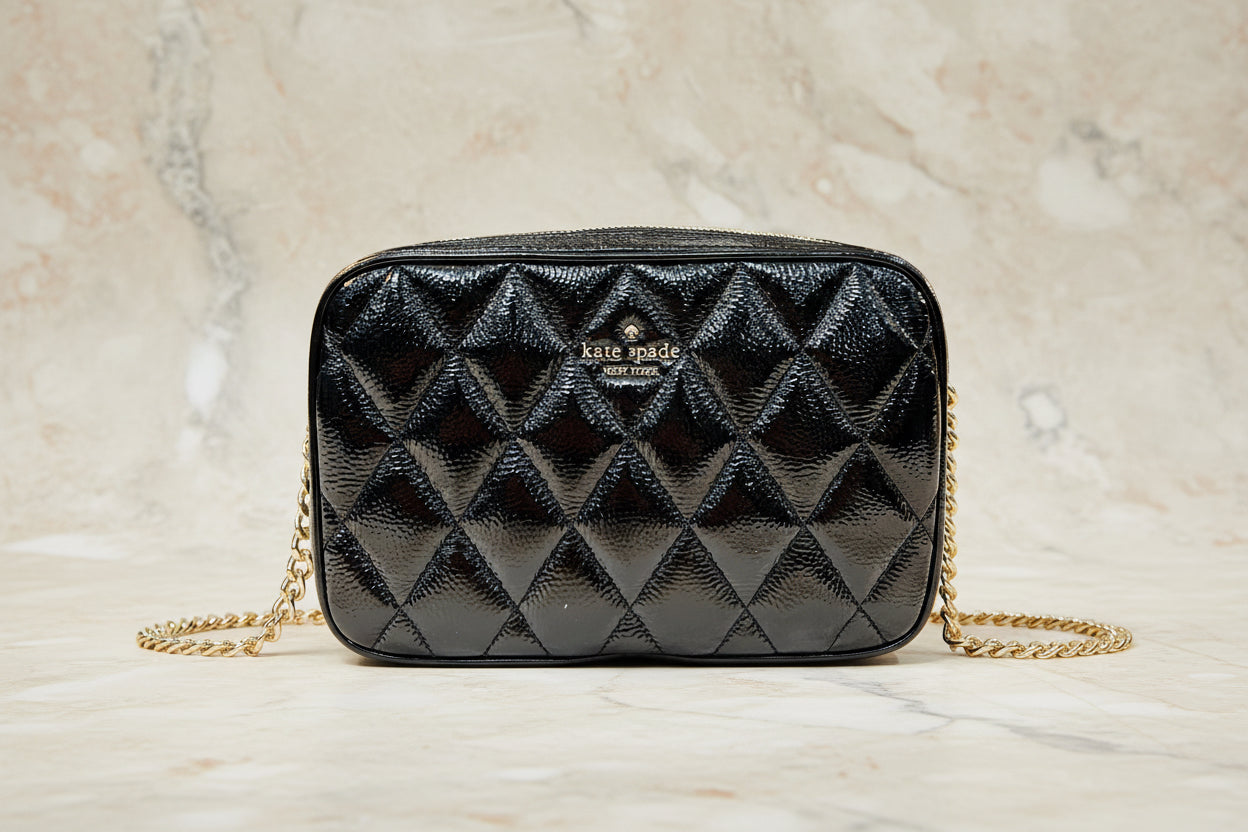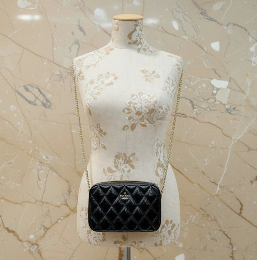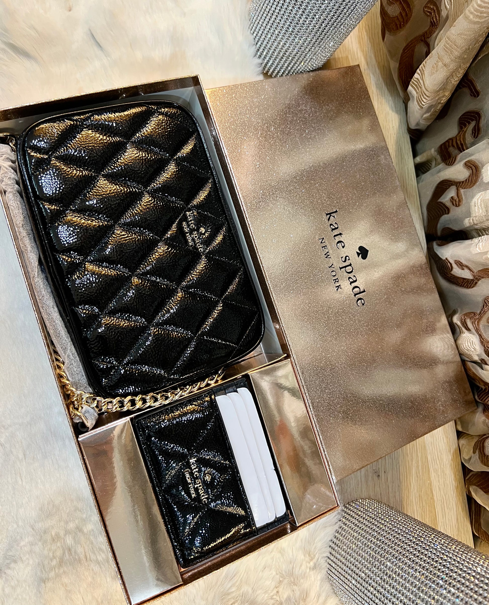 حقيبة كروسبودي من الجلد المبطن من كيت سبيد، مع حافظة بطاقات رفيعة، في علبة.
