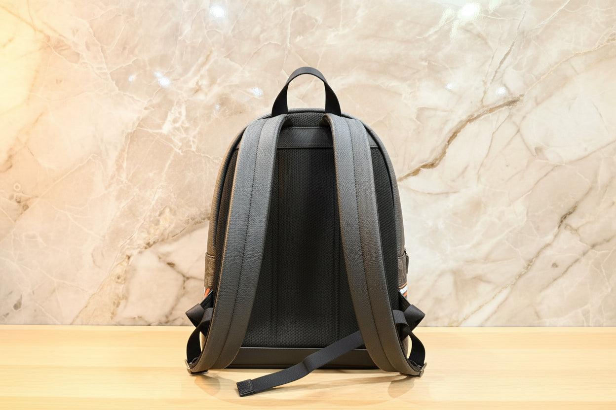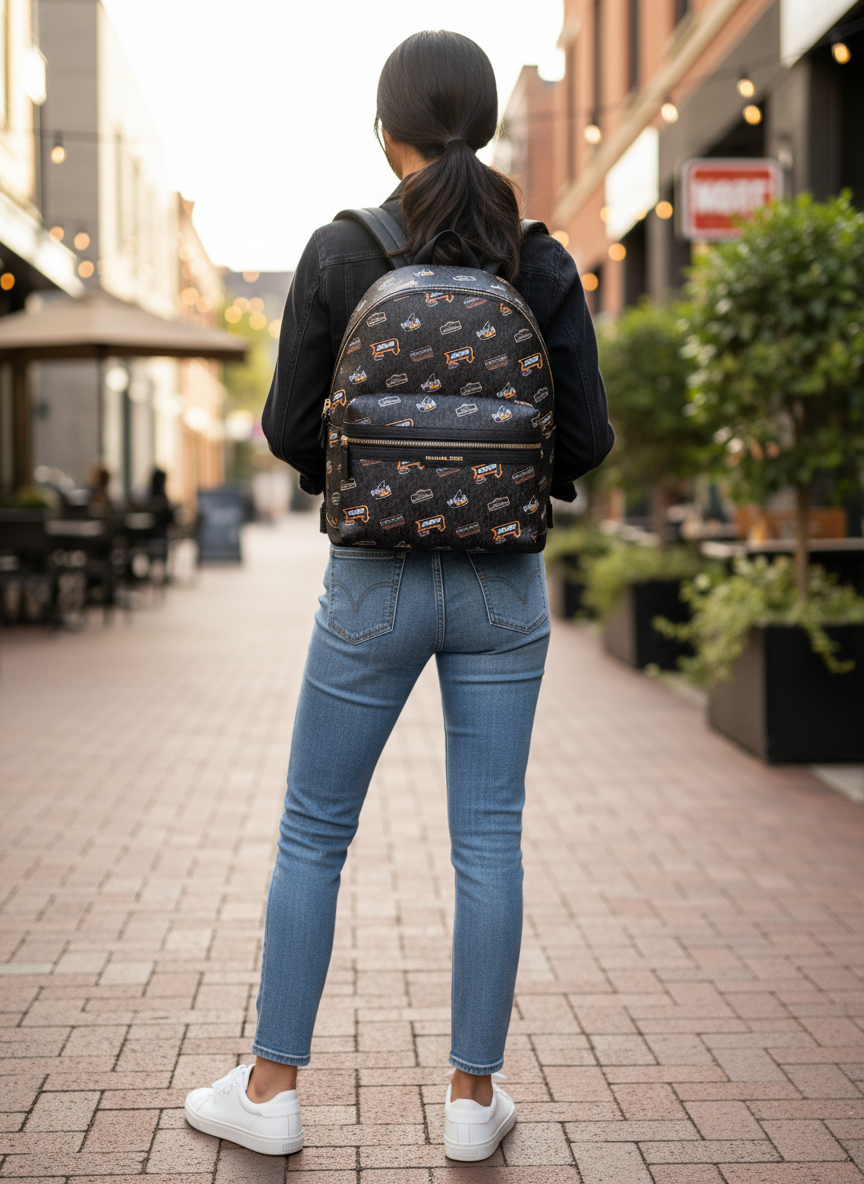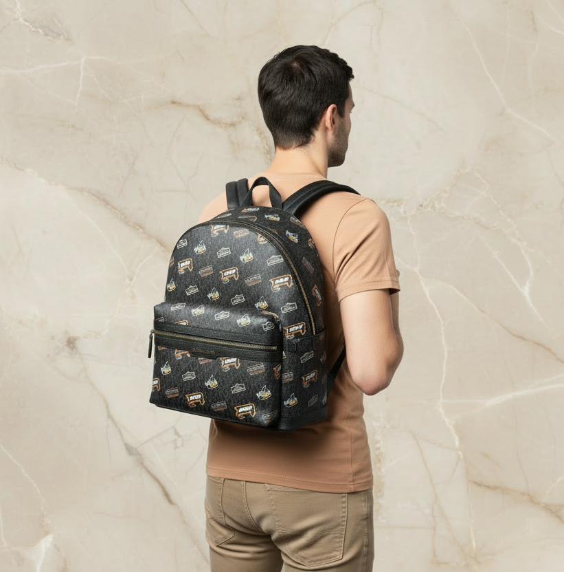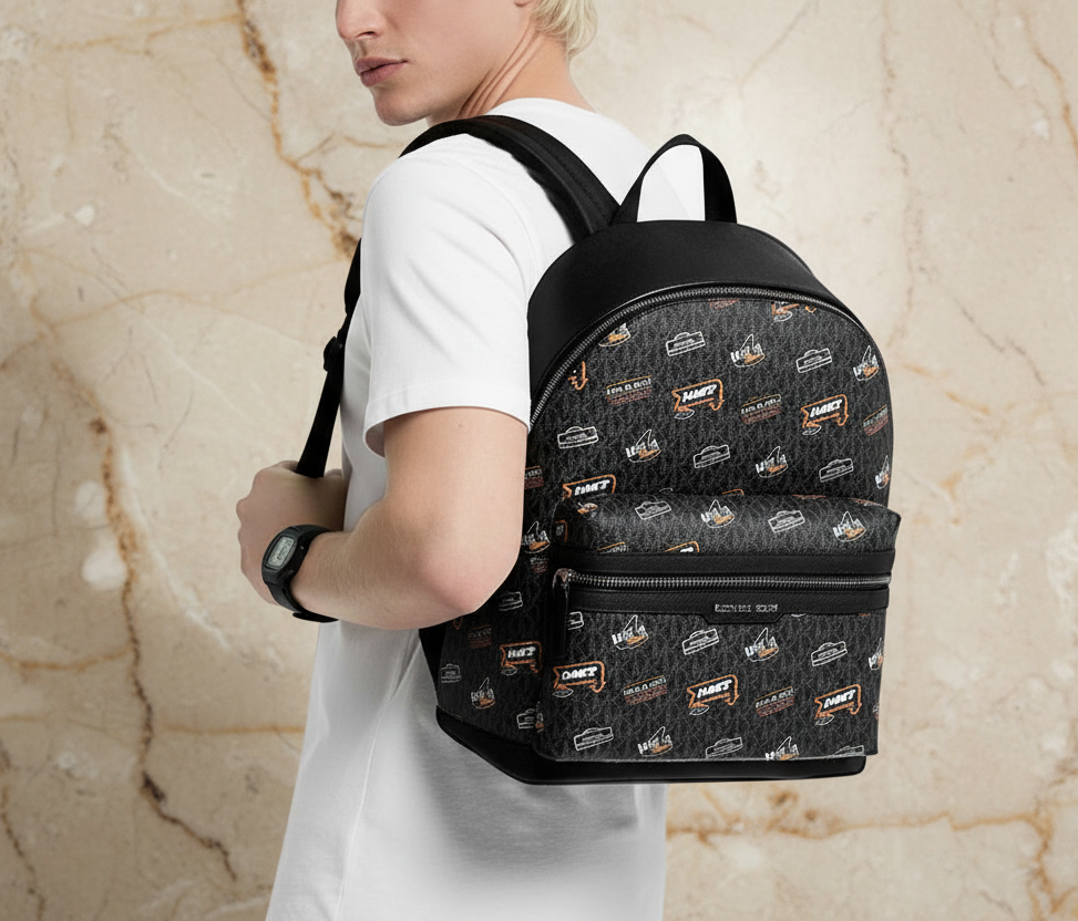 حقيبة ظهر، قماش مطبوع عليه شعار، 90% قماش مطلي/10% بوليستر، إكسسوارات معدنية بلون رمادي داكن، تفاصيل خارجية: جيب أمامي بسحاب، تفاصيل داخلية: جيب للهاتف، حجرة للكمبيوتر المحمول والتابلت، البطانة: 100% بوليستر، إغلاق بسحاب.