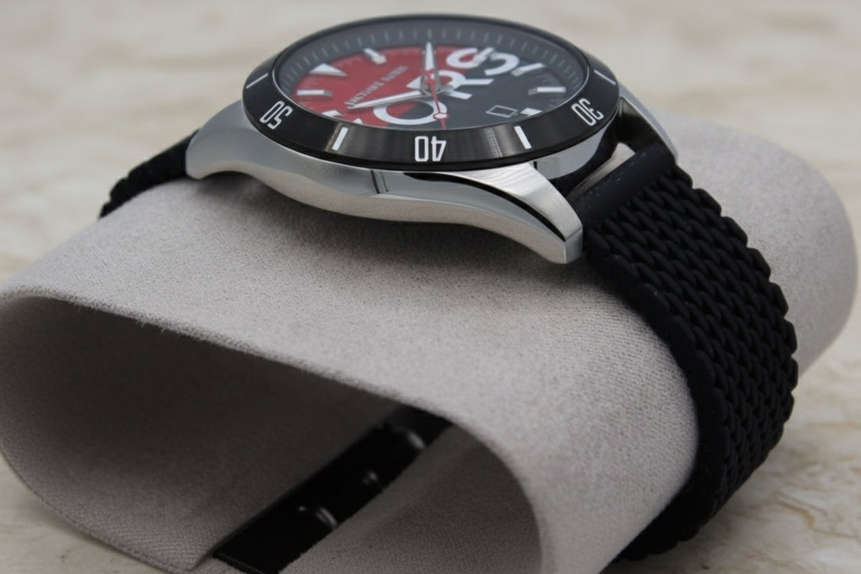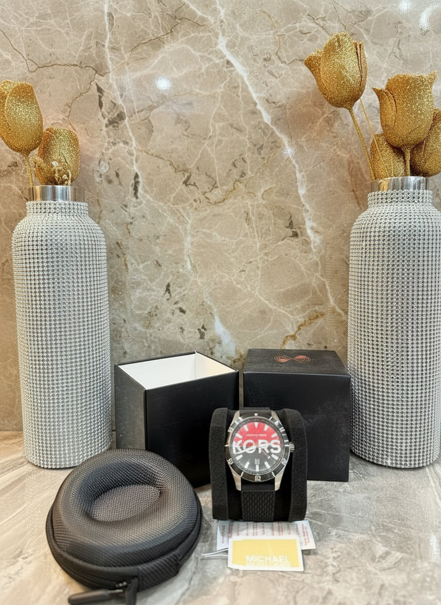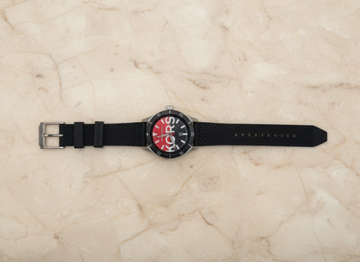 ساعة مايكل كورس لايتون هي ساعة رجالية باللونين الأسود والأحمر. يتميز هذا الموديل بهيكل فضي من الفولاذ المقاوم للصدأ، وميناء أسود وأحمر مزين بنقوش بارزة، وسوار من السيليكون الأسود. تحتوي الساعة على نافذة لعرض التاريخ وغطاء زجاجي. كما أنها مقاومة للماء حتى عمق 50 مترًا، مما يوفر حماية من رذاذ الماء. وتعتمد الساعة على آلية كوارتز دقيقة.