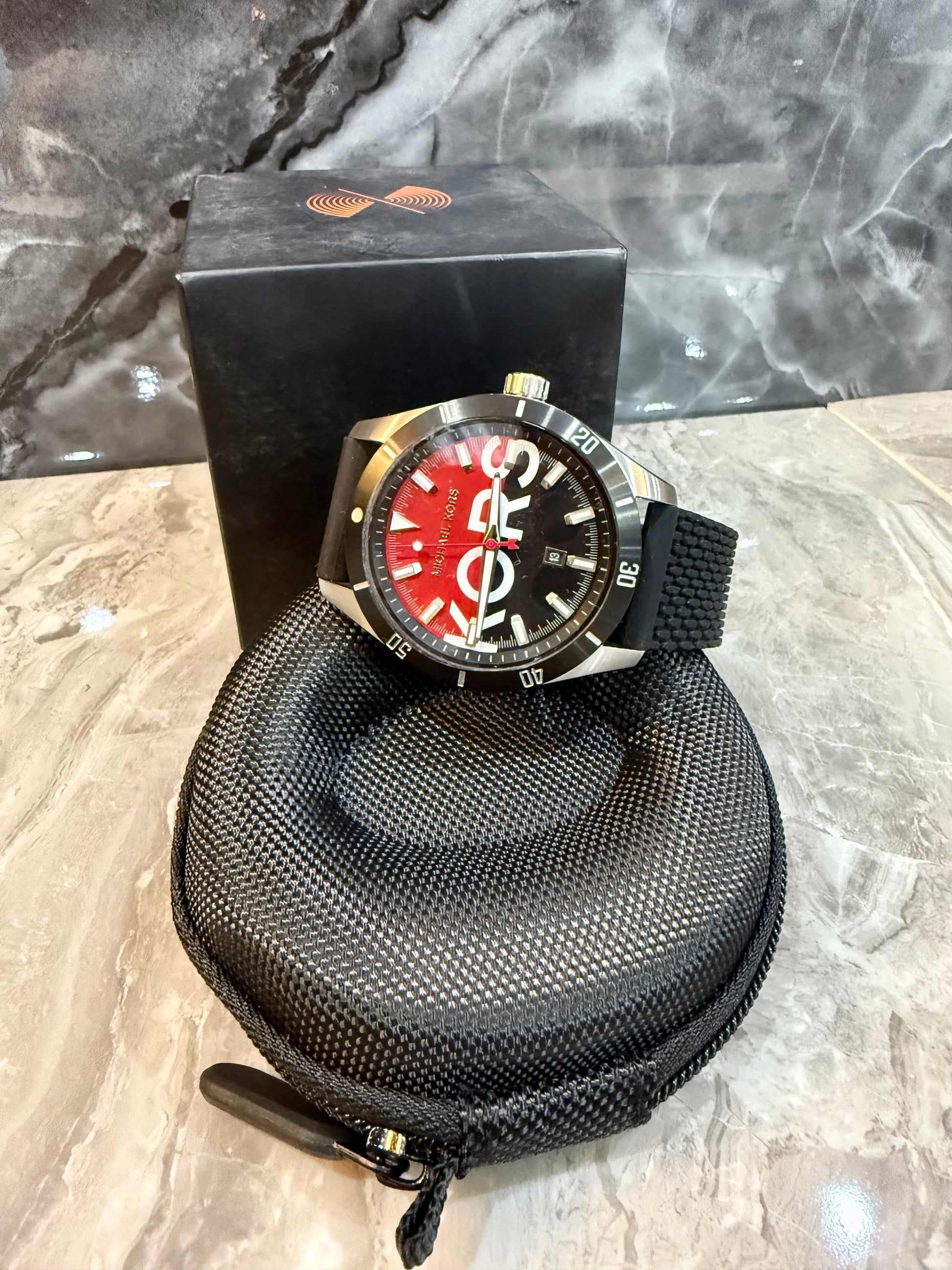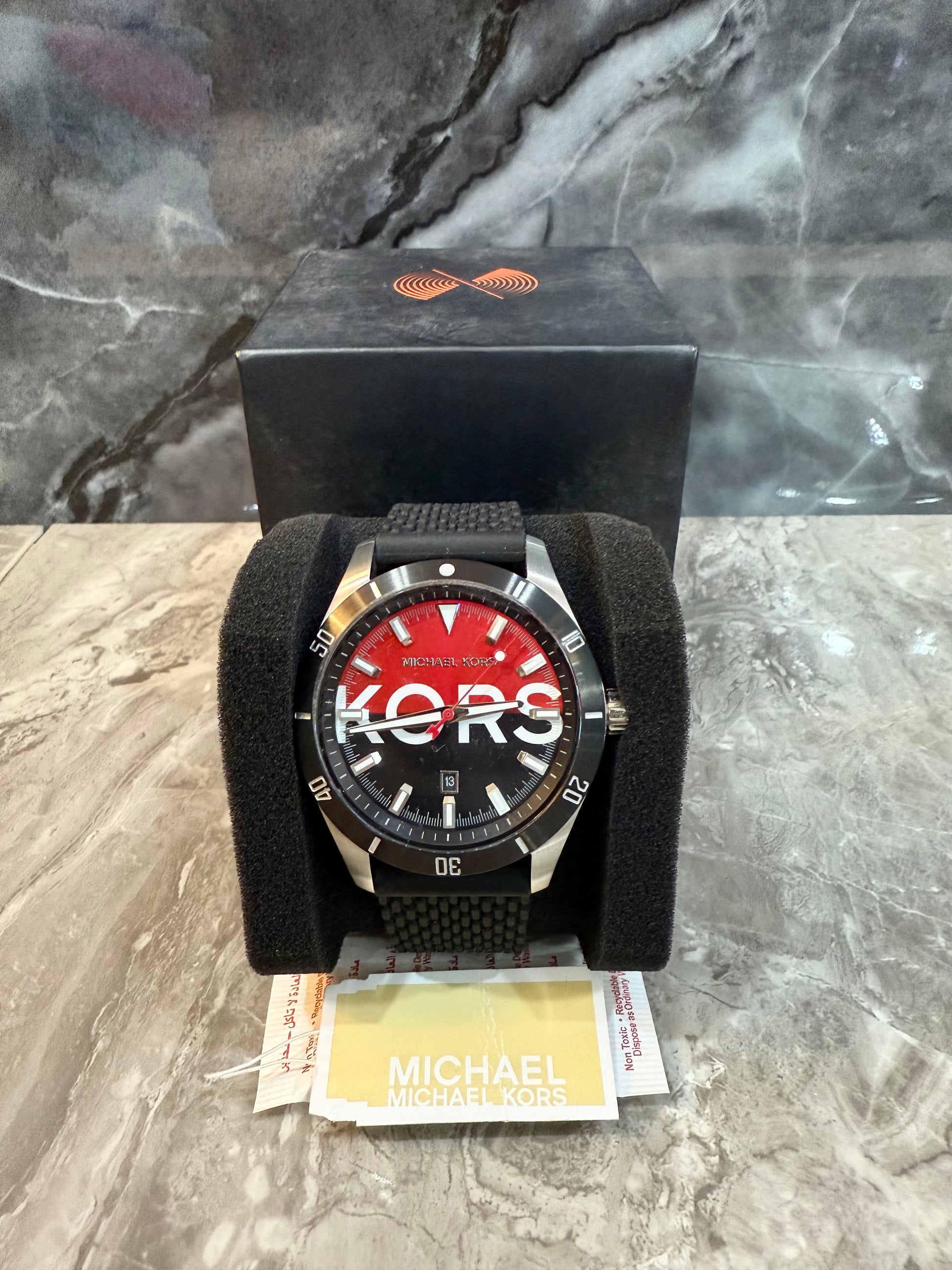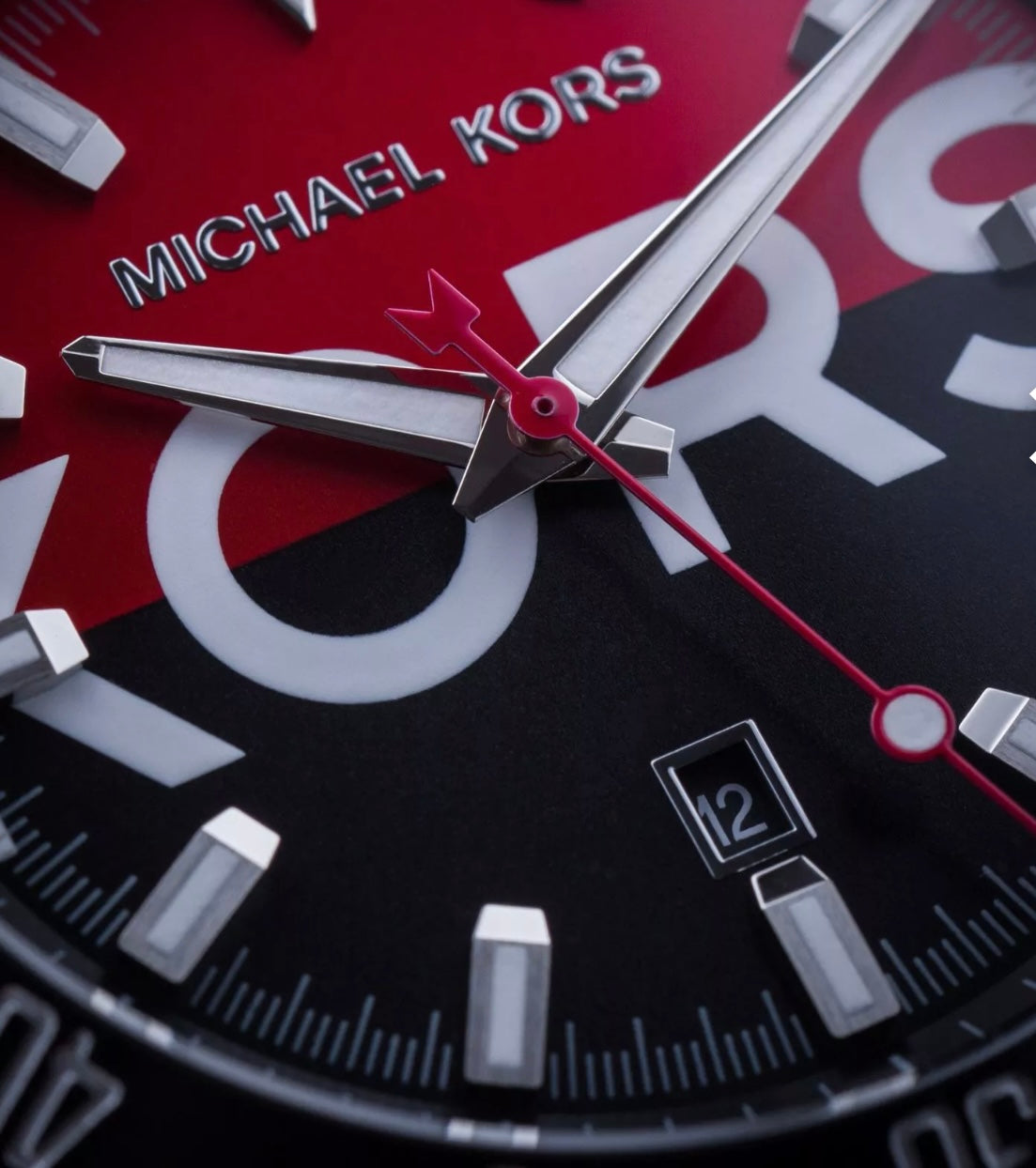 ساعة مايكل كورس لايتون هي ساعة رجالية باللونين الأسود والأحمر. يتميز هذا الموديل بهيكل فضي من الفولاذ المقاوم للصدأ، وميناء أسود وأحمر مزين بنقوش بارزة، وسوار من السيليكون الأسود. تحتوي الساعة على نافذة لعرض التاريخ وغطاء زجاجي. كما أنها مقاومة للماء حتى عمق 50 مترًا، مما يوفر حماية من رذاذ الماء. وتعتمد الساعة على آلية كوارتز دقيقة.