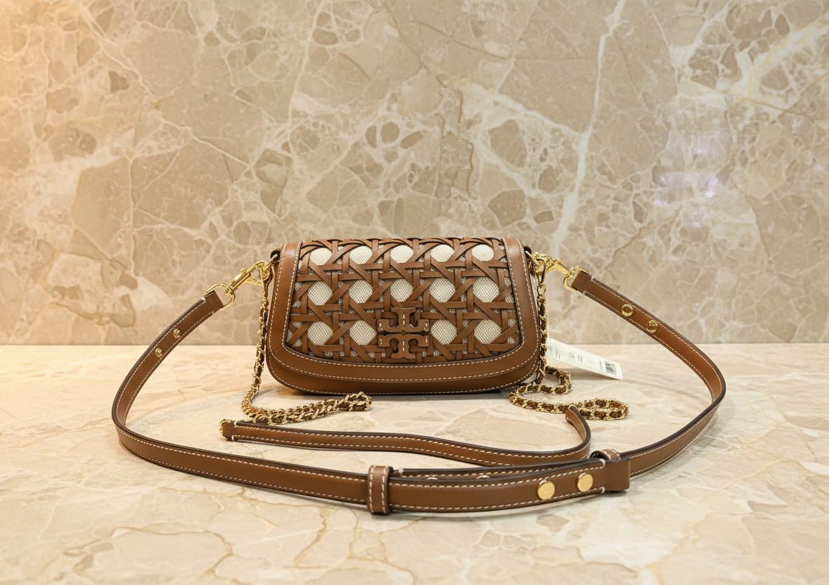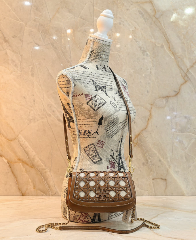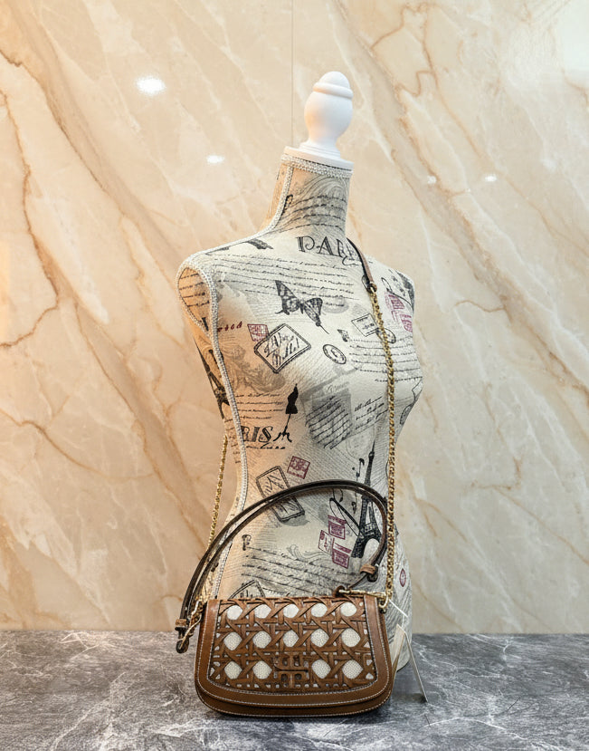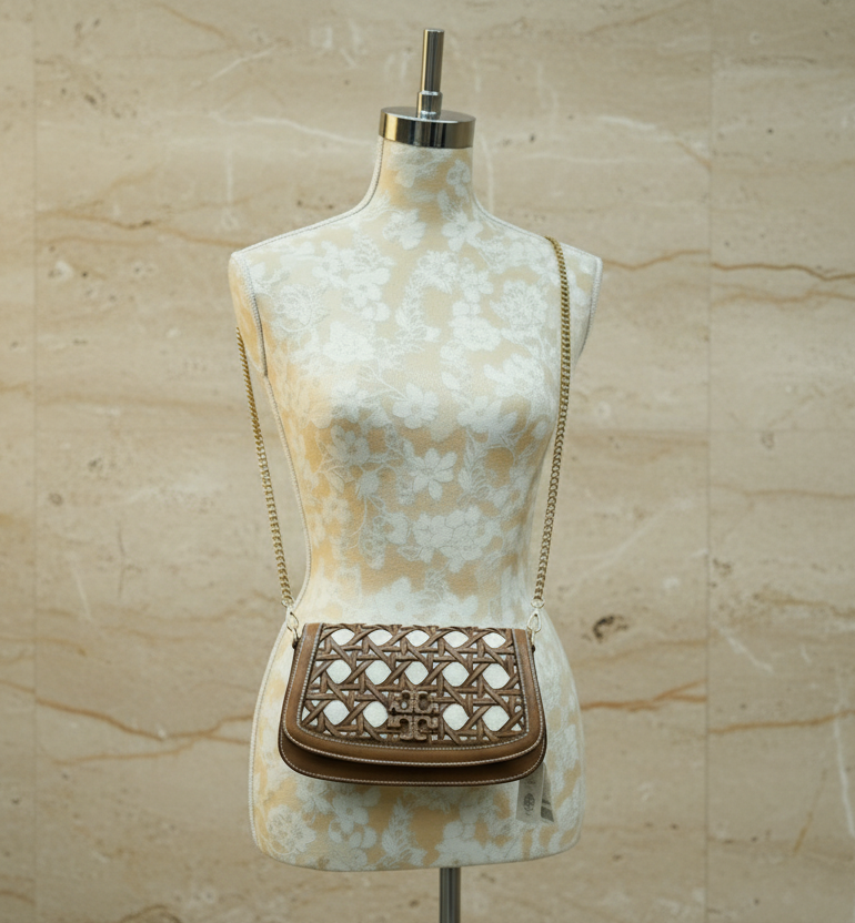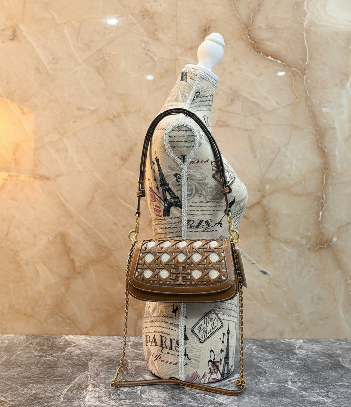 * مصنوع يدويًا من الجلد والقماش، مستوحى من السلال المنسوجة بنمط الخيزران الكلاسيكي
