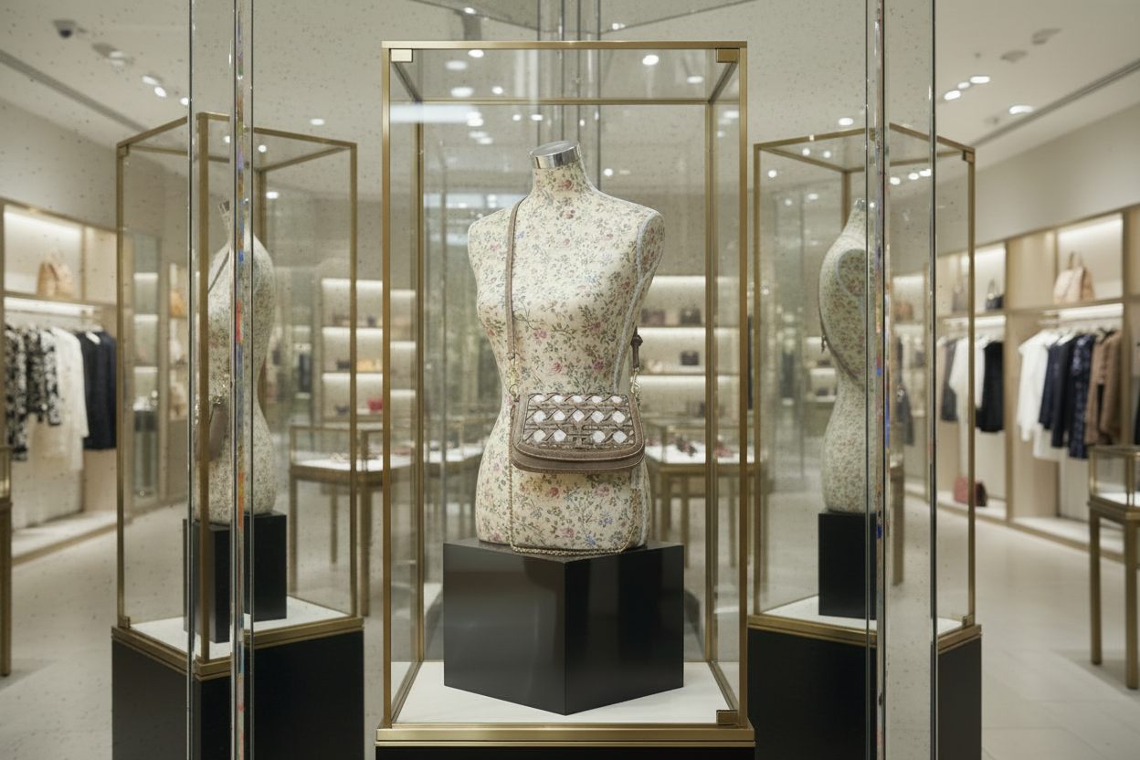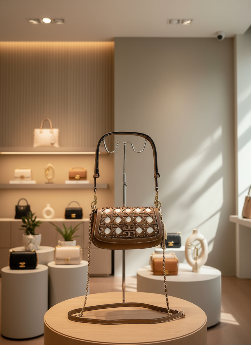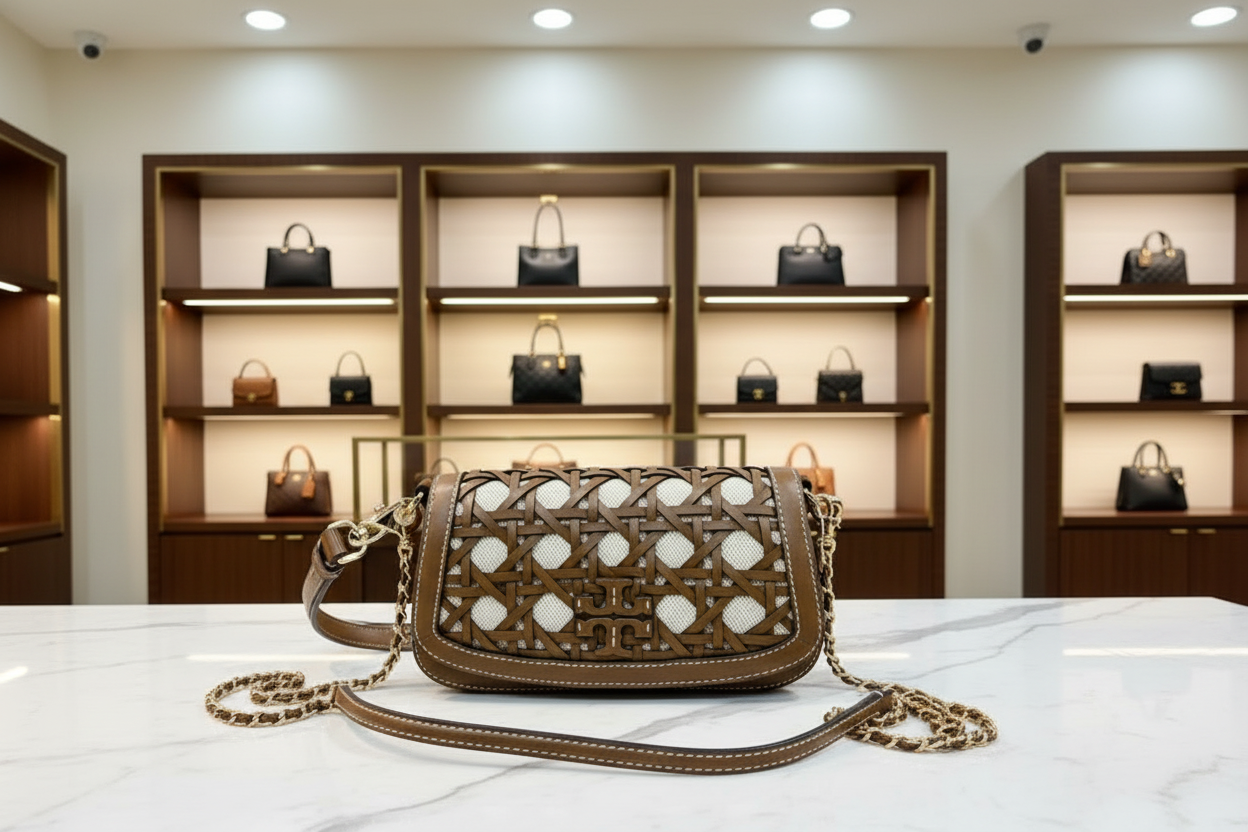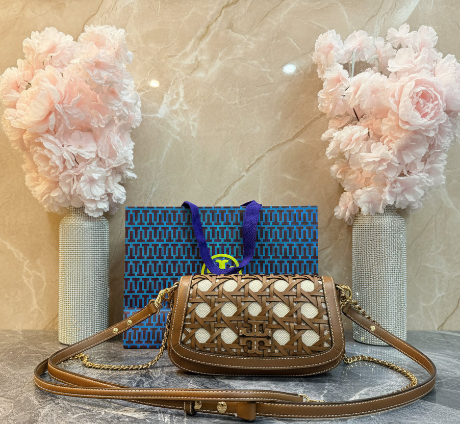 * مصنوع يدويًا من الجلد والقماش، مستوحى من السلال المنسوجة بنمط الخيزران الكلاسيكي
