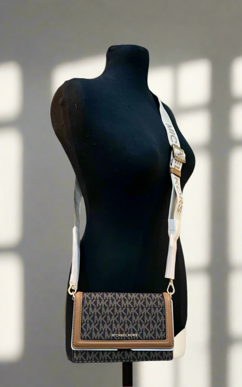 MICHAEL KORS JET SET LOGO SMARTPHONE CROSSBODY BAG- BROWN ACORN - WOVEN